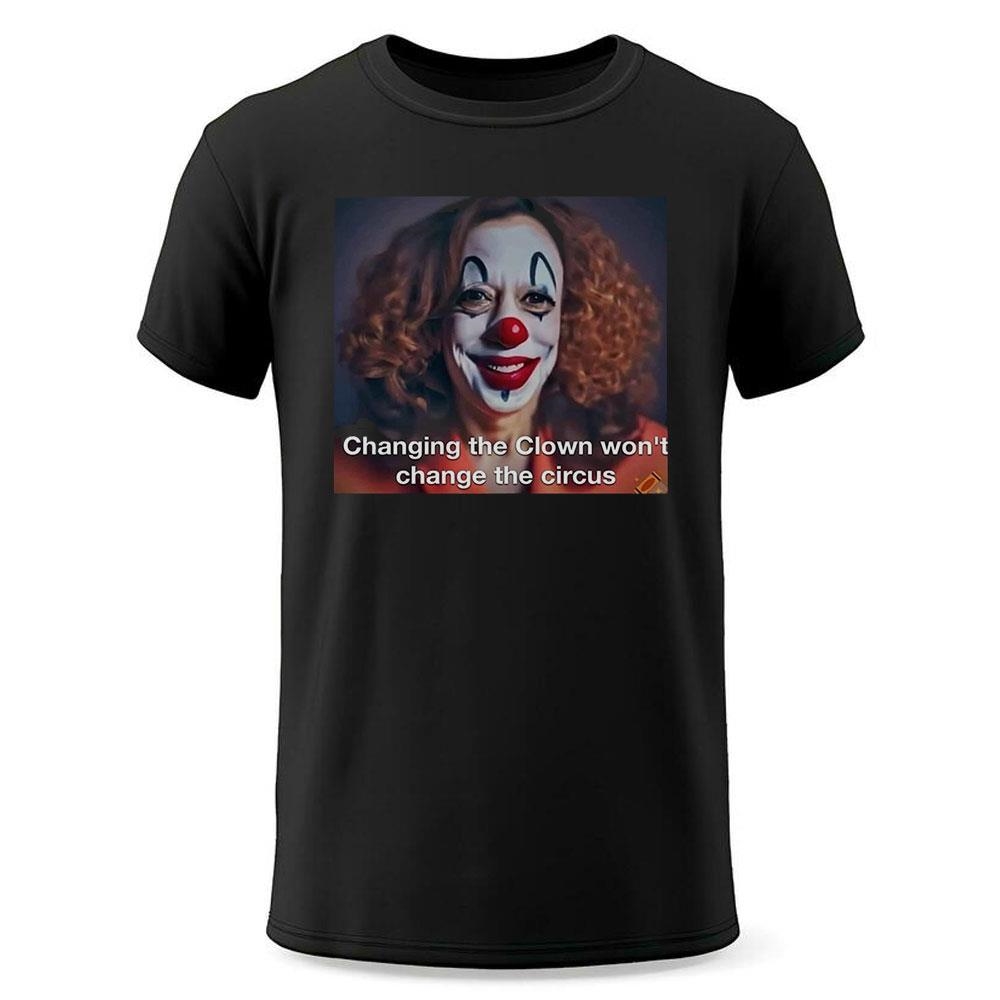 The design features a clown motif, which can be interpreted as a commentary on the perceived absurdity or circus-like nature of politics. By “changing the clown”, the shirt suggests that Harris is disrupting the status quo and challenging the traditional ways of doing things.