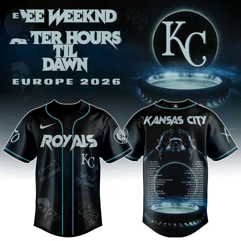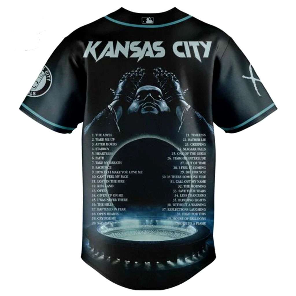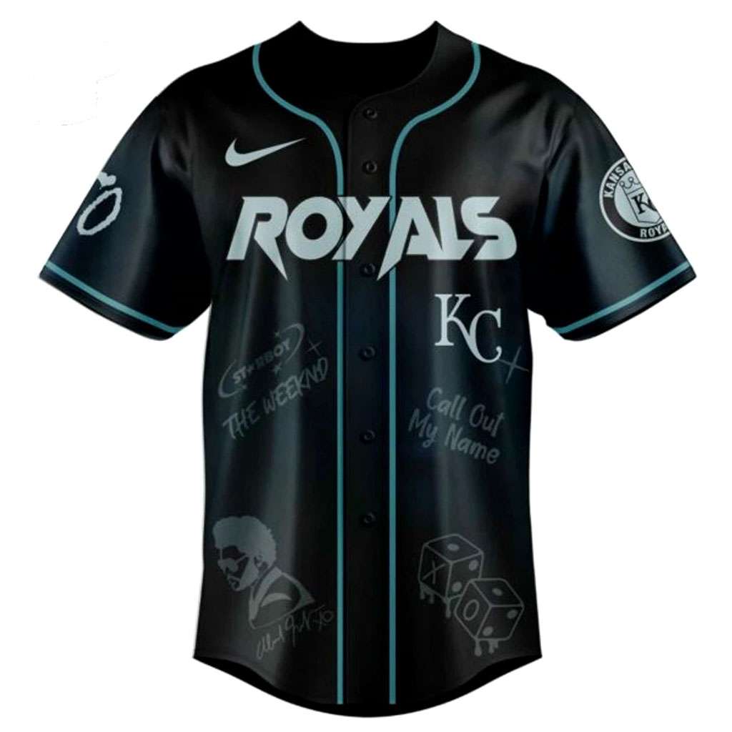 Hit a style home run with the “Kansas City Royals Weekend After Hours Till Dawn Baseball Jersey.” This design is a witty fusion of diamond-side spirit and late-night revelry. The sleek black base features bold white “ROYALS” lettering across the chest, complemented by a playful, handwritten “KC Call Out My Name” script—a clear nod to iconic tracks defining an “after hours” vibe. Subtle light blue piping accents the design, while the front panels boast integrated, dark-themed graphics of skulls and dice for an edgy, urban aesthetic. The back unveils an epic scene: a shadowy, hooded figure overlooking a glowing arena stage, encircled by a phantom setlist, perfectly capturing the ‘Till Dawn’ concert experience for any Royals fan with a nocturnal soul.