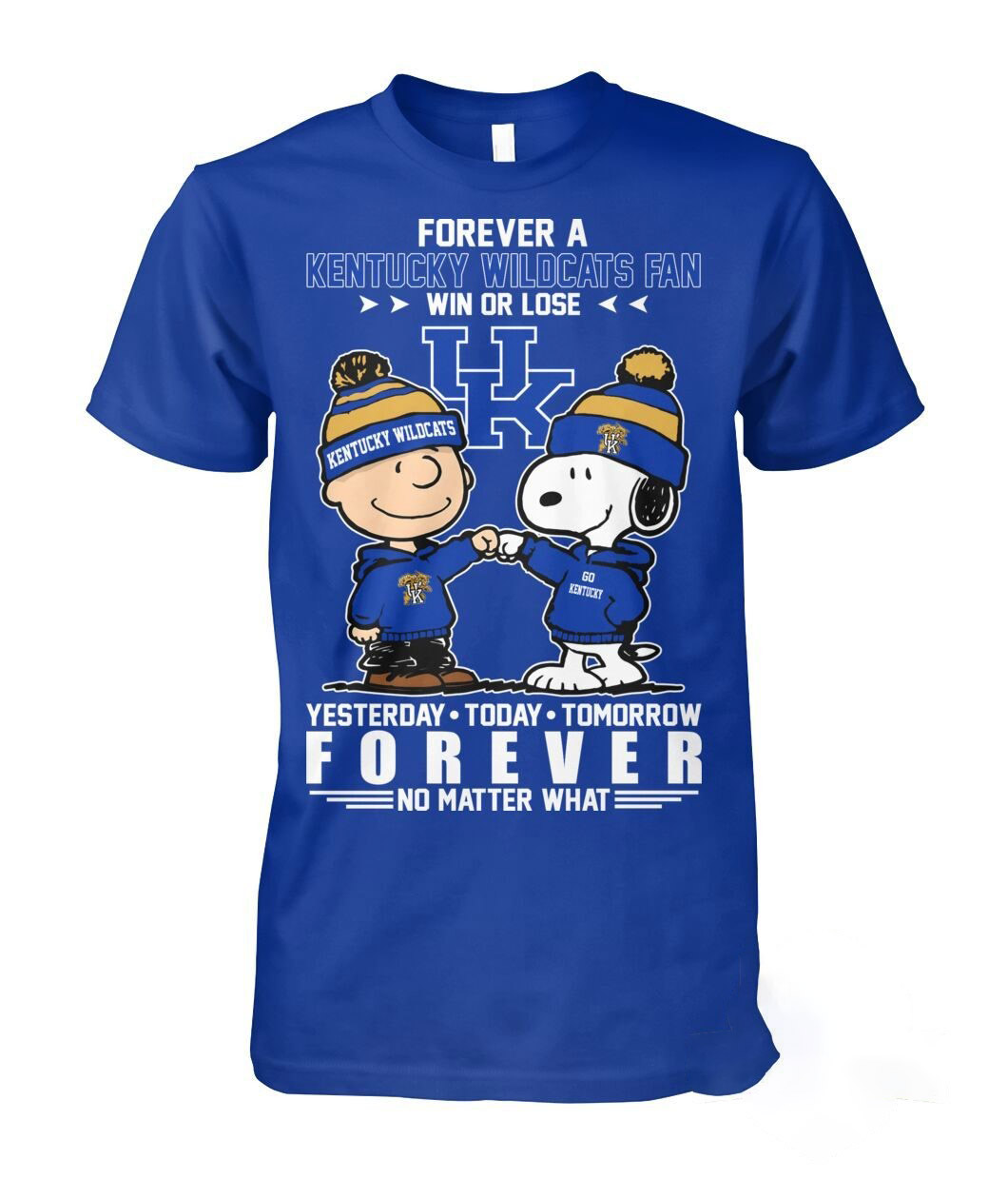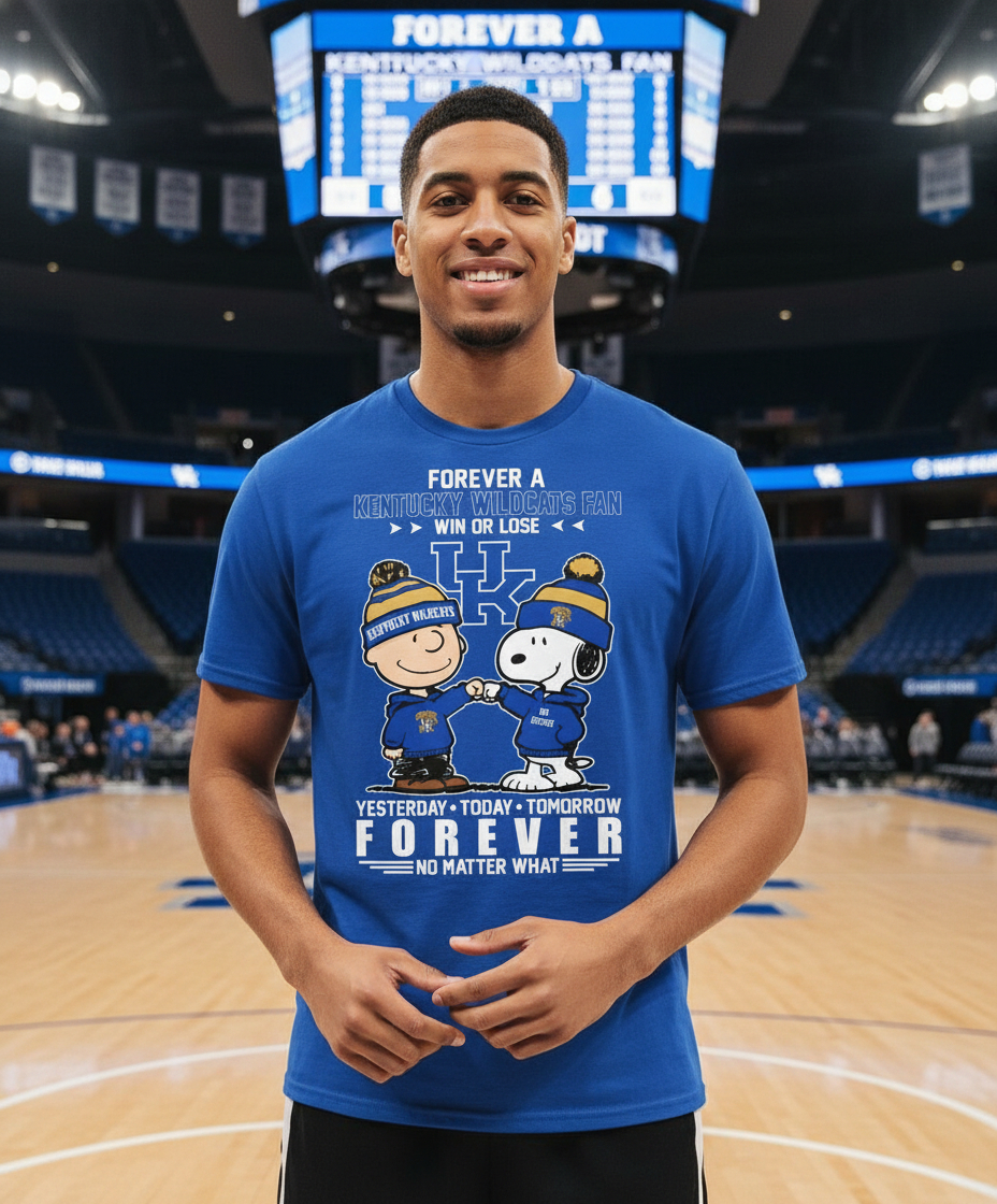 Looking for the ultimate display of team spirit? This Kentucky Wildcats Snoopy Charlie Brown Forever A Fan Win Or Lose Shirt perfectly captures the unwavering dedication of a true supporter. Adorned in vibrant Kentucky Wildcats blue, the design prominently features the iconic Peanuts duo, Charlie Brown and Snoopy, both decked out in matching blue hoodies and yellow-and-blue beanies – Charlie Brown’s declaring “KENTUCKY WILDCATS” and Snoopy’s “WILDCATS FOREVER.” They’re shown sharing a celebratory fist bump, symbolizing camaraderie and enduring loyalty. Above them, bold white text proudly proclaims “FOREVER A KENTUCKY WILDCATS FAN WIN OR LOSE,” framing the classic “UK” logo. Below the beloved characters, the heartfelt message “YESTERDAY • TODAY • TOMORROW FOREVER NO MATTER WHAT” reinforces the steadfast commitment to your favorite team, making this a humorous yet powerful tribute to Wildcats pride.