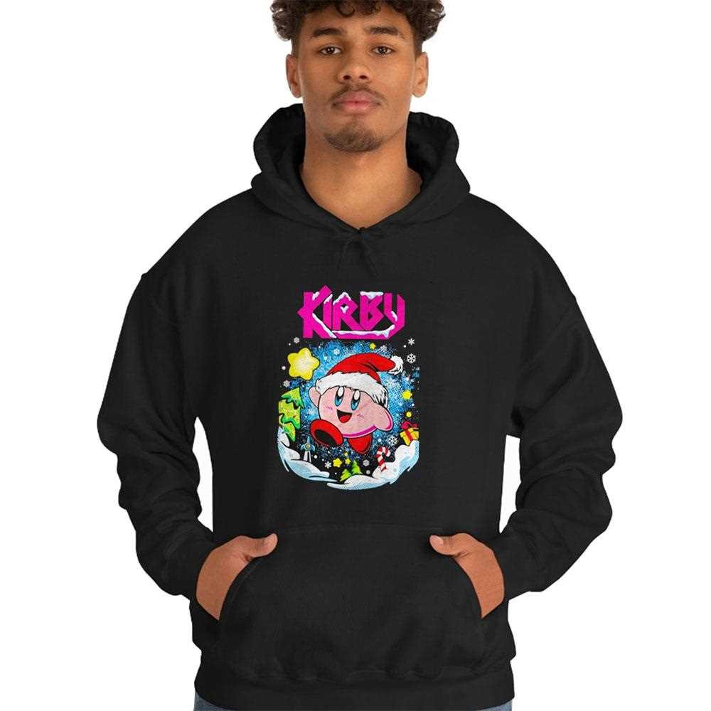 Bring some Nintendo magic to your winter wardrobe with this adorable Kirby design. The shirt showcases the beloved pink puffball, Kirby, looking absolutely delighted as he plays in a winter wonderland. Dressed in a festive Santa hat, Kirby is surrounded by falling snowflakes and snow-covered trees, creating a heartwarming scene that radiates joy. The phrase “Hail To The Snow” is written in a playful, bubbly font that matches Kirby’s round aesthetic. The colors are bright and vivid, with the signature pink of the character standing out beautifully against the cool blues and whites of the snowy background. It’s the perfect shirt for gamers who want to celebrate the season without sacrificing their geeky style.