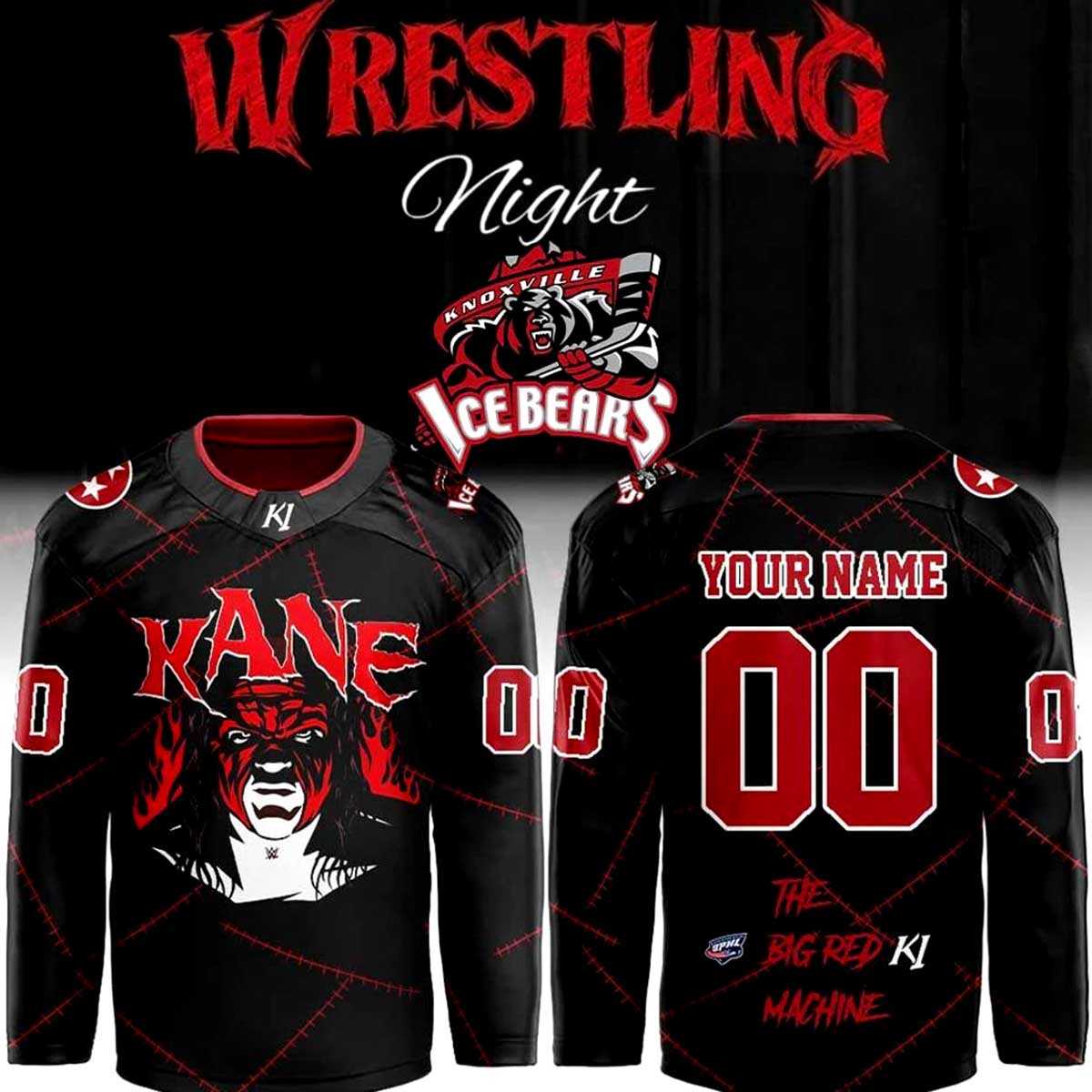 Step into the squared circle, then onto the ice, with the fiery Knoxville Ice Bears Our Wrestling Night Edition Custom Name Jersey! This show-stopping design smashes together the worlds of hockey and professional wrestling, featuring a fearsome, iconic masked wrestler’s face, reminiscent of ‘The Big Red Machine’ Kane, rendered in bold red and white with jagged, flame-like outlines across a sleek black background. Above this inferno, the name ‘KANE’ is emblazoned in a striking red font, complemented by diagonal red ‘stitch’ patterns throughout the black fabric, echoing the intensity of a wrestling bout. With customizable name and numbers (’00’ shown on sleeves and back), along with subtle stars on the shoulders, this jersey perfectly captures the raw energy and theatrical flair of a special ‘Wrestling Night’ event, inviting fans to embrace their inner beast.
