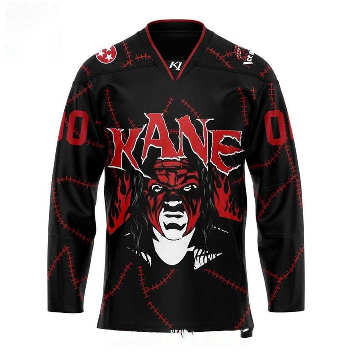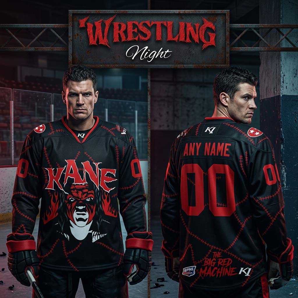 Unleash the “Big Red Machine” with the Knoxville Ice Bears Wrestling Night 2026 Big Red Machine Hockey Jersey! This electrifying black jersey, styled for a special event, is a fierce tribute to the legendary wrestler Kane. The front roars with a dominant red and white graphic of Kane’s iconic masked face, framed by fiery red tendrils and bold red “KANE” lettering, all against a unique stitched black fabric texture. Overhead, “WRESTLING Night” blazes in menacing red and elegant white script, hinting at the thrilling crossover event. With contrasting red numbers on the sleeves and shoulder patches, this design humorously merges the intensity of professional wrestling with hard-hitting hockey, celebrating an unforgettable night where the ice meets the squared circle.