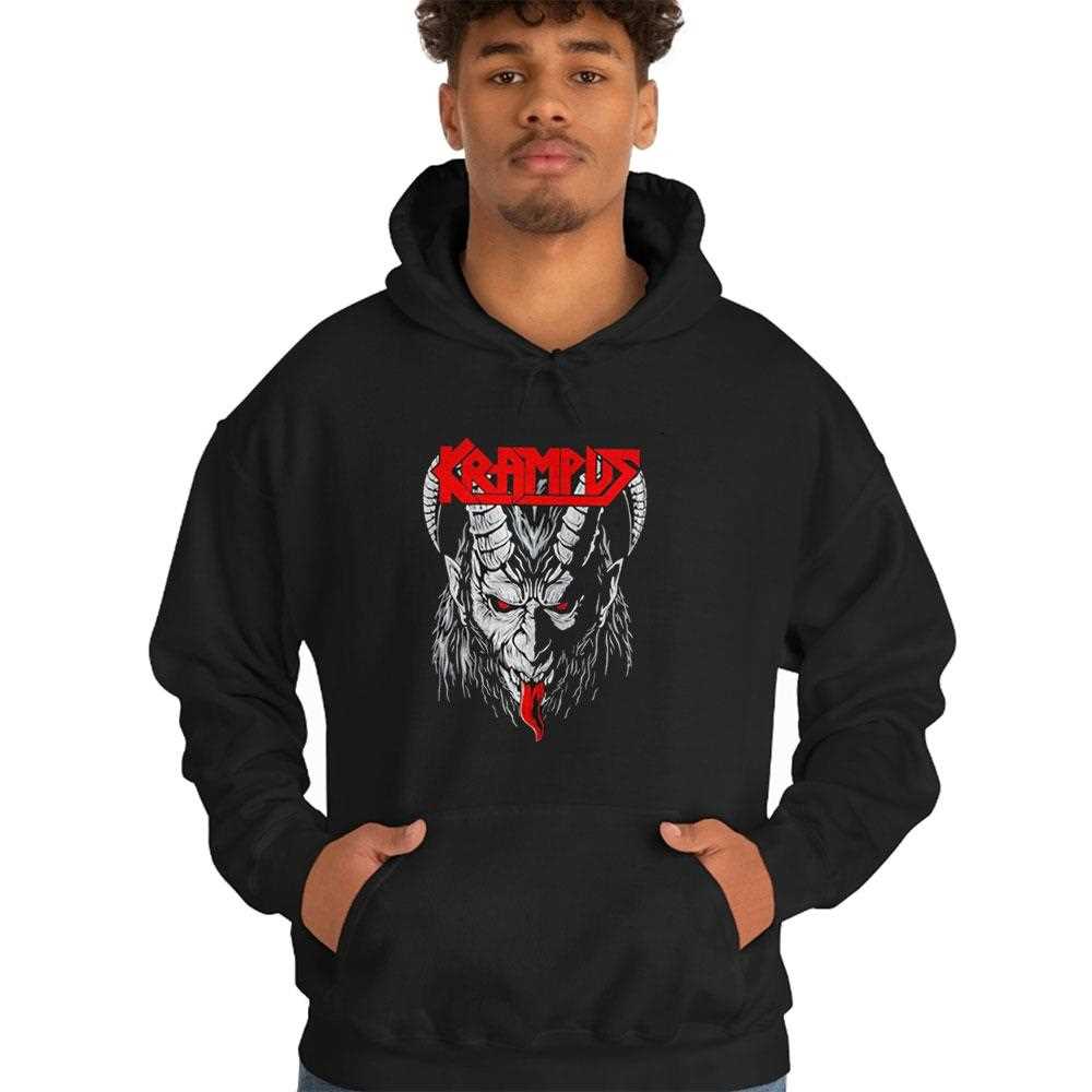 For those who prefer a little fright with their festivities, this Krampus shirt is a masterpiece of horror art. The design features a hyper-realistic, terrifying illustration of the legendary Christmas demon, complete with long curved horns, a shaggy beard, and piercing eyes that stare right into your soul. The monochrome grey and white palette gives it a ghostly, metal-band merchandise aesthetic, while the blood-red “KRAMPUS” typography adds a sinister touch. It’s a stark departure from cheerful holiday wear, perfect for horror movie buffs, metalheads, or anyone who acknowledges the folklore punishment of the naughty list. The intricate detailing in the fur and fangs makes this a high-quality piece of wearable art.
