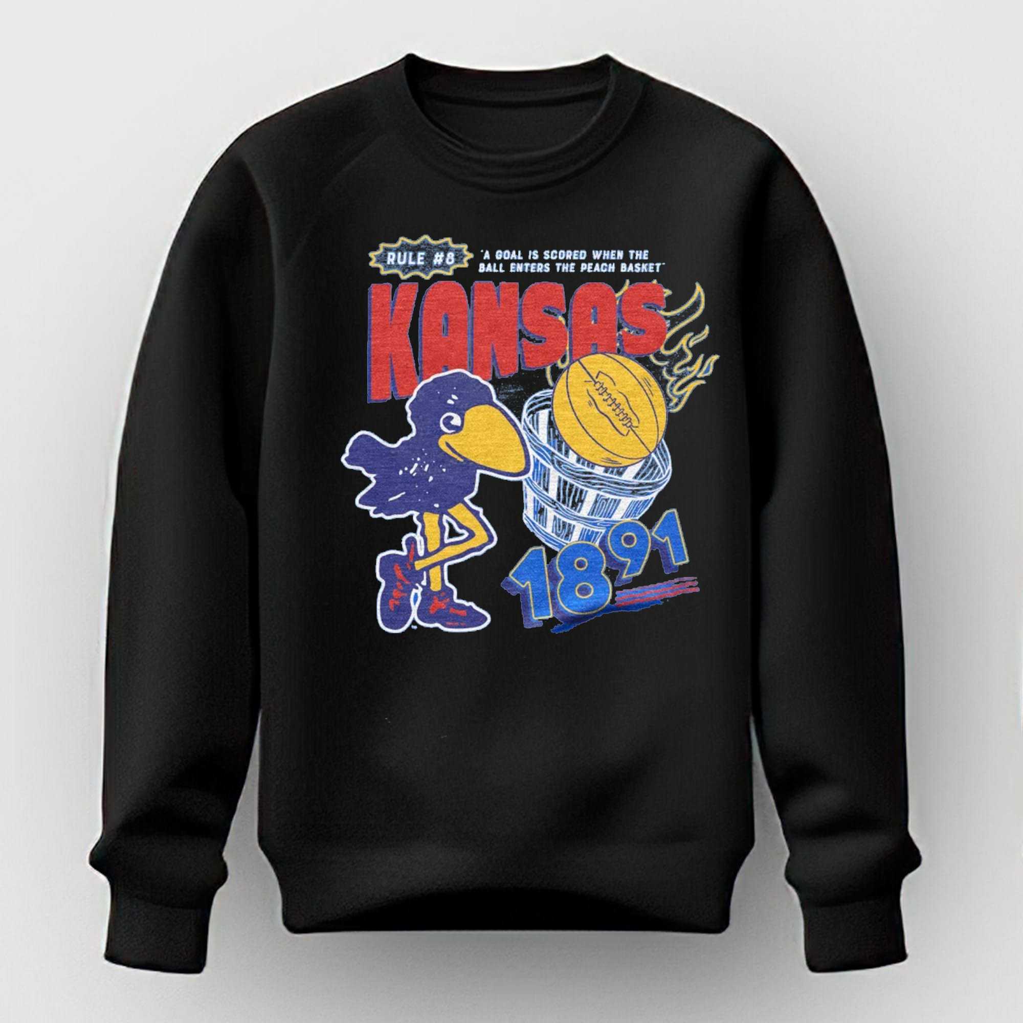 Looking for a unique way to celebrate basketball’s roots? The KU Basketball 8 Rule Shirt is an absolute slam dunk! This captivating design vividly illustrates early basketball history, featuring a bold, distressed red “KANSAS” across the top. To the left, a classic blue Jayhawk mascot, complete with a yellow beak and legs, playfully watches a yellow basketball with detailed lacing descend into an old-fashioned white and blue peach basket on the right. Above the central text, a blue banner proudly states “RULE #8,” accompanied by the quaint, original rule: “‘A GOAL IS SCORED WHEN THE BALL ENTERS THE PEACH BASKET.'” Anchoring the bottom, the significant “1891” in blue and yellow commemorates the sport’s birth and its enduring connection to the University of Kansas, offering a witty and nostalgic tribute to the game’s earliest days.
