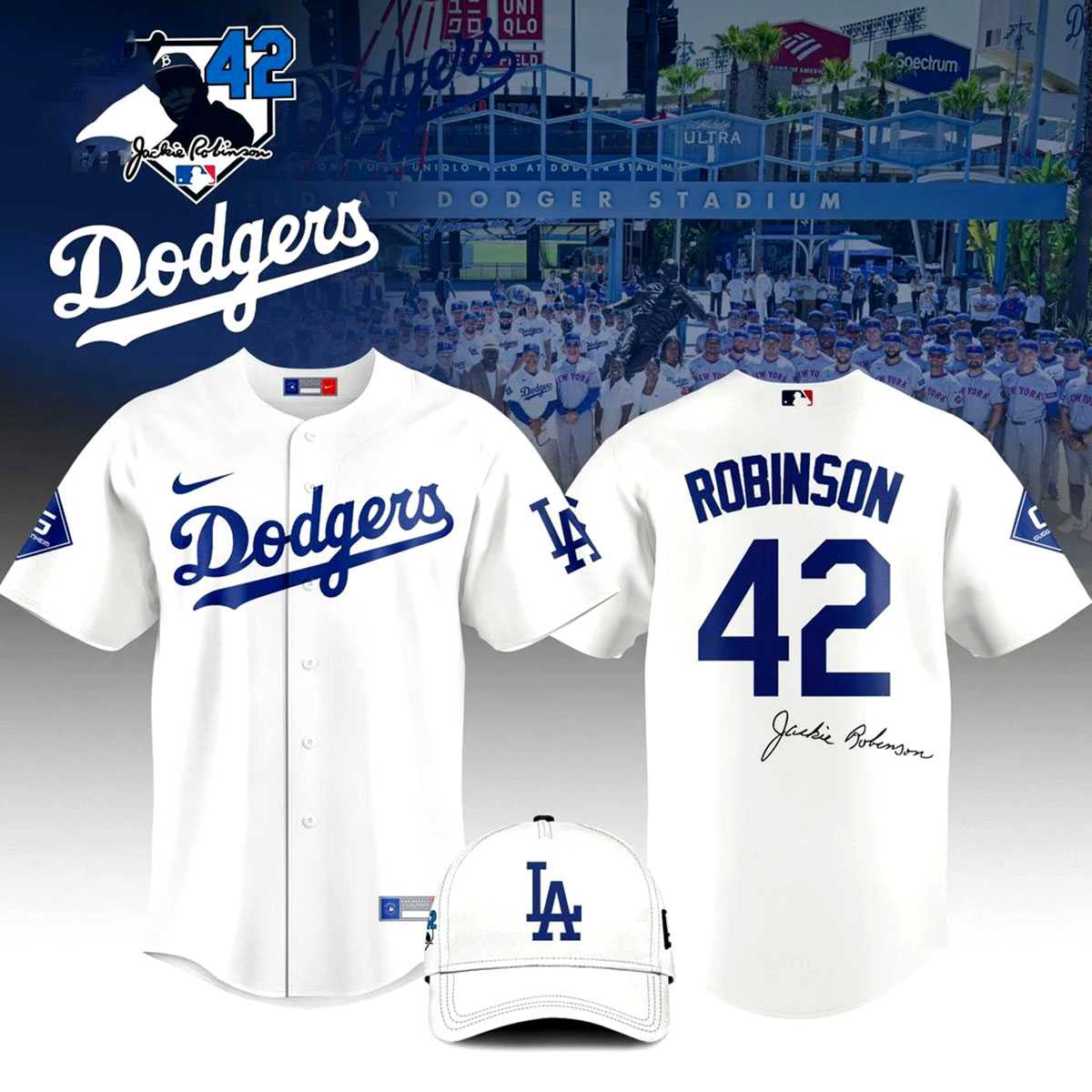 Celebrate the man who changed the game with the LA Dodgers Jackie Robinson Day 2026 Baseball Jersey. This authentic-style home white jersey is a tribute to Jackie Robinson’s legacy and his impact on the Dodgers franchise. Featuring his iconic number “42” in the classic Dodgers blue, this piece is an essential for any true baseball fan.The jersey is meticulously crafted with high-quality tackle-twill numbering and lettering. The “Dodgers” script on the front is perfectly rendered, accompanied by a special commemorative patch that marks the 2026 celebration of Jackie Robinson Day. Made from professional-grade, moisture-wicking polyester, it provides a cool and comfortable fit that mirrors what the players wear on the field.This isn’t just a jersey; it’s a piece of history. Whether you’re at Dodger Stadium or watching from home, wearing this jersey shows your respect for Jackie’s courage and talent. The clean, classic design ensures it will never go out of style, making it a generational piece for Dodgers fans.Honor a true pioneer! Buy your LA Dodgers Jackie Robinson Day 2026 Baseball Jersey today and represent the legendary number 42.
