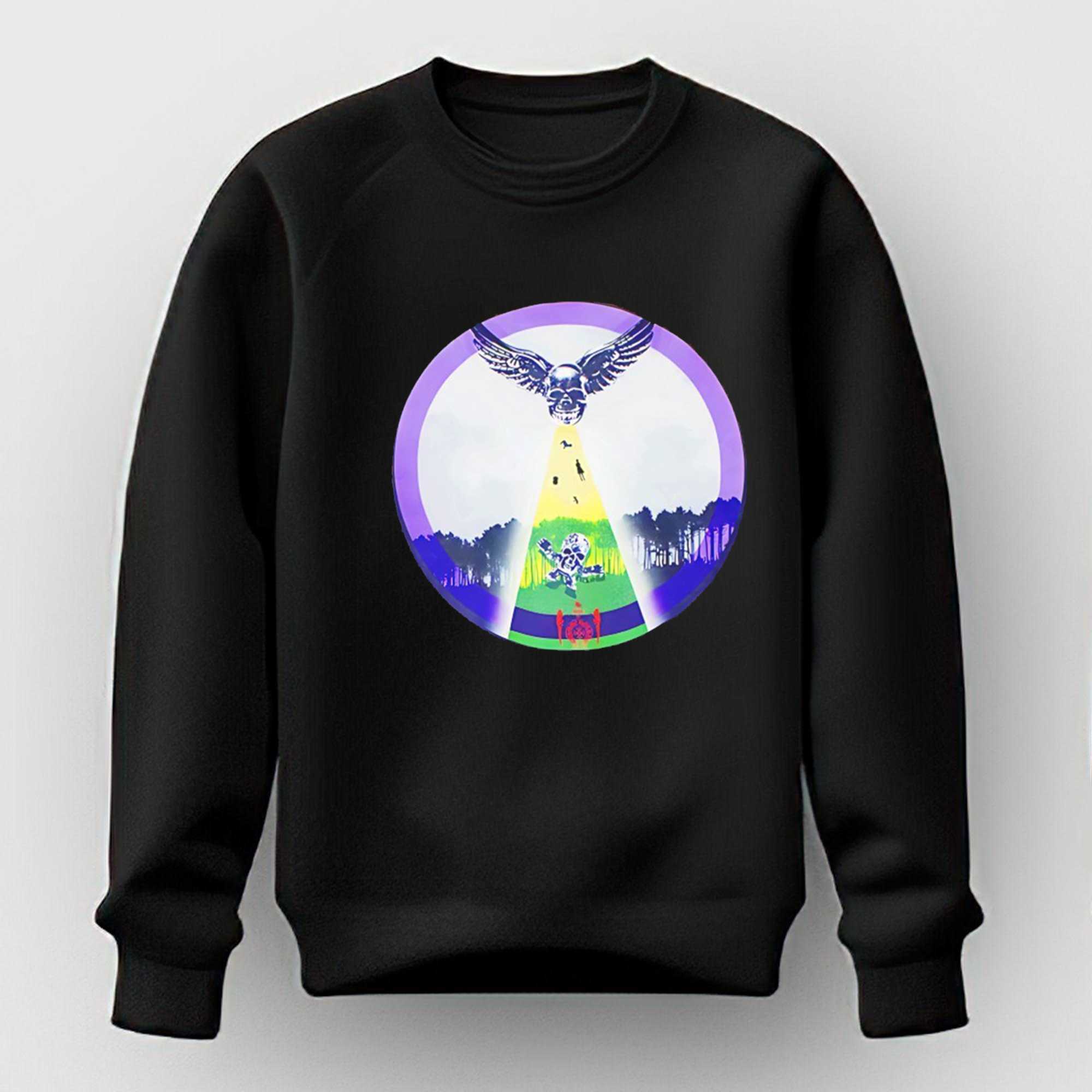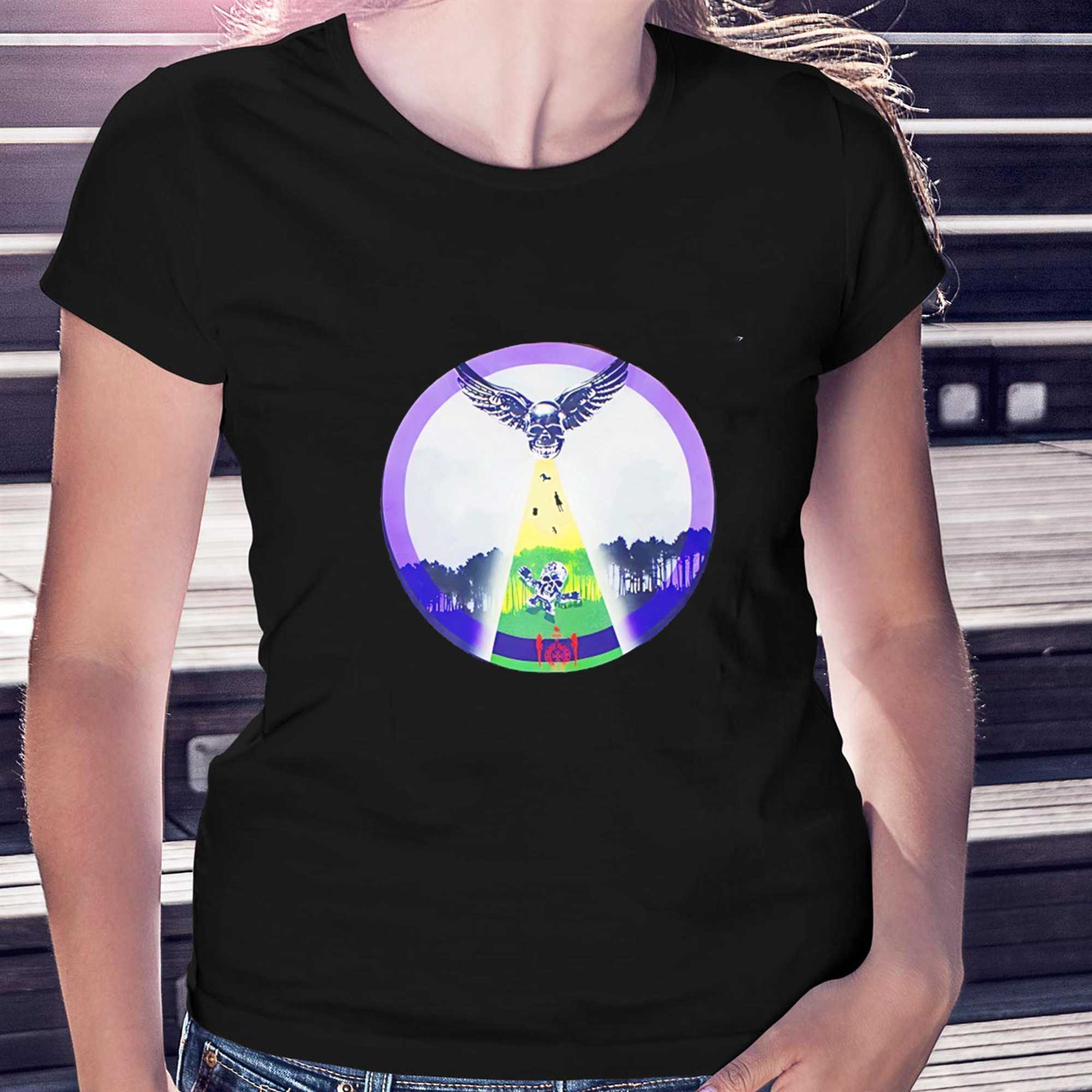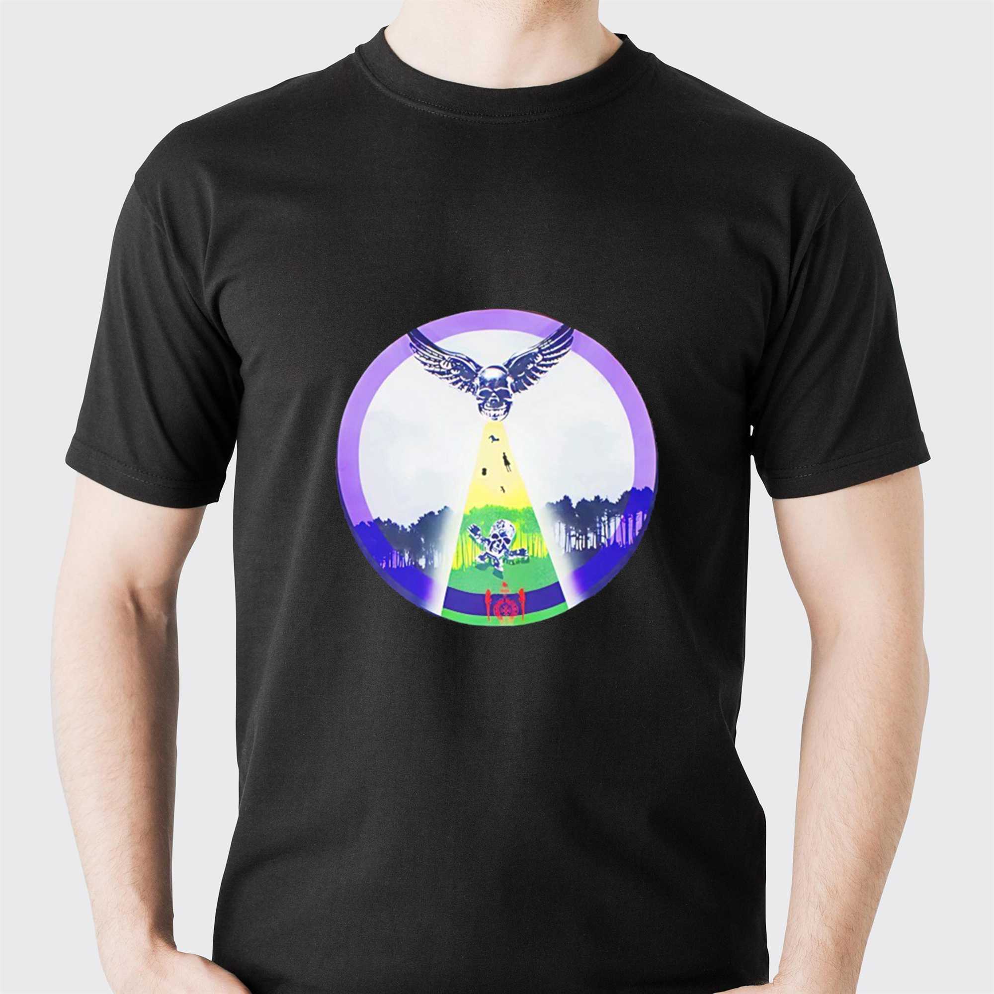 Embark on a visual journey through the mysterious and atmospheric world of extraterrestrial lore with the Lc Foti Abduction Tee. This design is a masterclass in high-concept graphic art, featuring a stunning illustration of a classic UFO abduction scene. The artwork captures the sheer wonder and eerie beauty of a glowing spacecraft hovering over a tranquil landscape, utilizing a palette of electric purples and greens that pop vividly against the black canvas. It’s a brilliant piece of visual storytelling that appeals to sci-fi aficionados and fans of alternative culture who value the enigma of the stars.