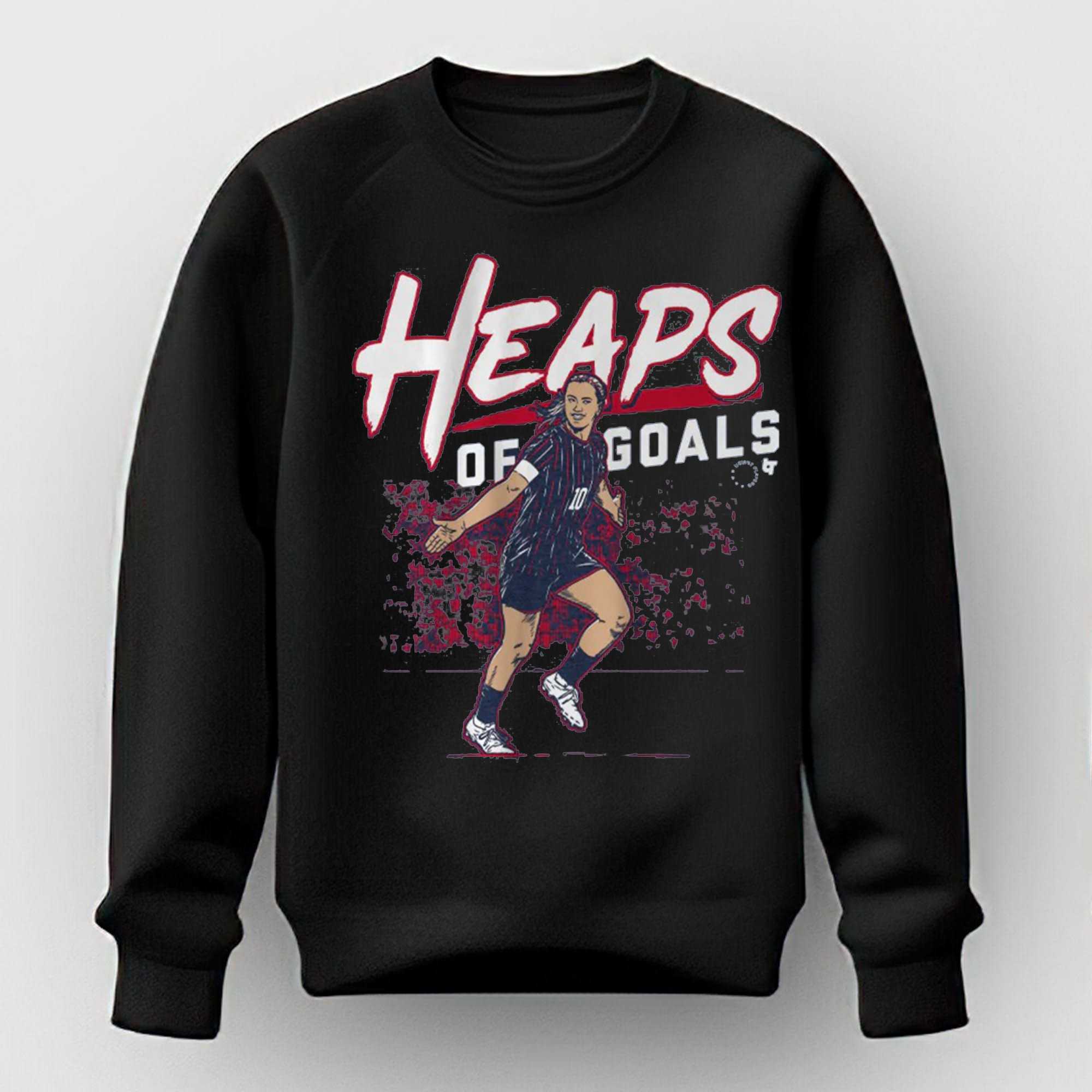Score big with the “Lindsey Heaps Heaps of Goals Shirt”! This dynamic design is a witty tribute to a soccer star, vividly depicting a smiling female player, number 10, in her dark, vertically striped jersey, white armband, and cleats, celebrating a goal with outstretched arms. Above her, the large, white script “HEAPS” with a bold red outline prominently sits, positioned over the smaller, grey “OF GOALS.” The entire graphic is set against a vibrant red and dark blue distressed background, creating an explosive sense of motion that perfectly captures the excitement and humor of scoring “heaps” of goals.