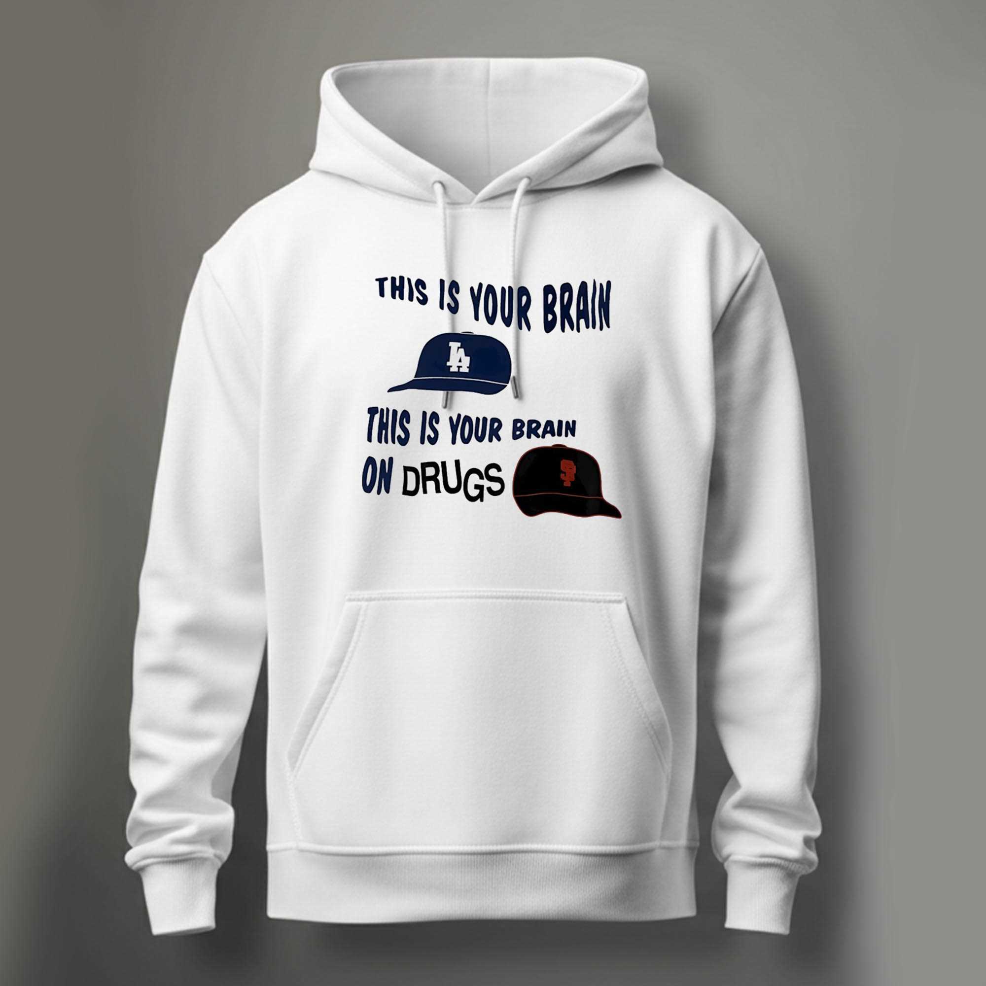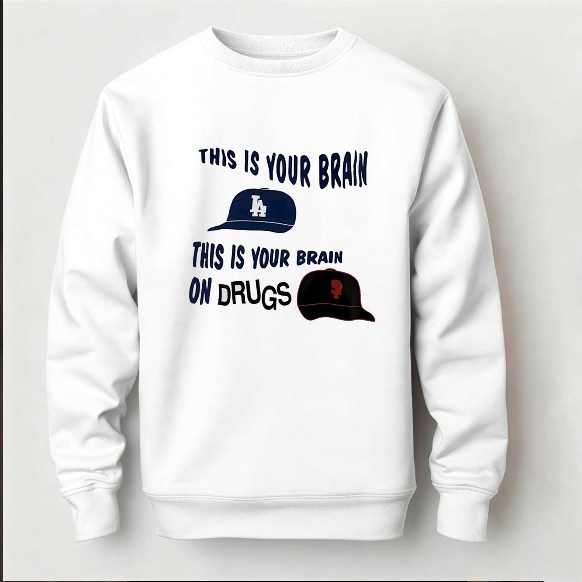 Poke fun at one of sports’ greatest rivalries with the hilarious Los Angeles Dodgers And San Francisco Giants This Is Your Brain On Drugs Tee. This design is a brilliant and creative parody of the famous anti-drug PSA of the 80s, featuring a “cracked” baseball representing the mind on a diet of Giants and Dodgers competition. The artwork captures the chaotic intensity and the slightly irrational passion that defines the NorCal vs. SoCal feud. The use of the iconic team logos alongside the humorous “This is your brain…” slogan makes it a guaranteed ice-breaker for any fan of California baseball. The colors are bright and saturated, ensuring the joke lands instantly whether you’re at Oracle Park or Dodger Stadium. This tee is more than just a joke; it’s a celebration of the rivalry that makes the game great. Made from a soft, premium cotton blend, it provides a comfortable, relaxed fit that is perfect for a day at the ballpark or a casual tailgate. The high-resolution print is durable and designed to remain vibrant through every heated inning. It represents a playful, self-aware personality that loves the game and the drama that comes with it. Stand out from the sea of standard jerseys with a look that is truly original. Spice up your fan gear with a touch of irony. Order your Los Angeles Dodgers And San Francisco Giants This Is Your Brain On Drugs Tee today!. T-shirt !