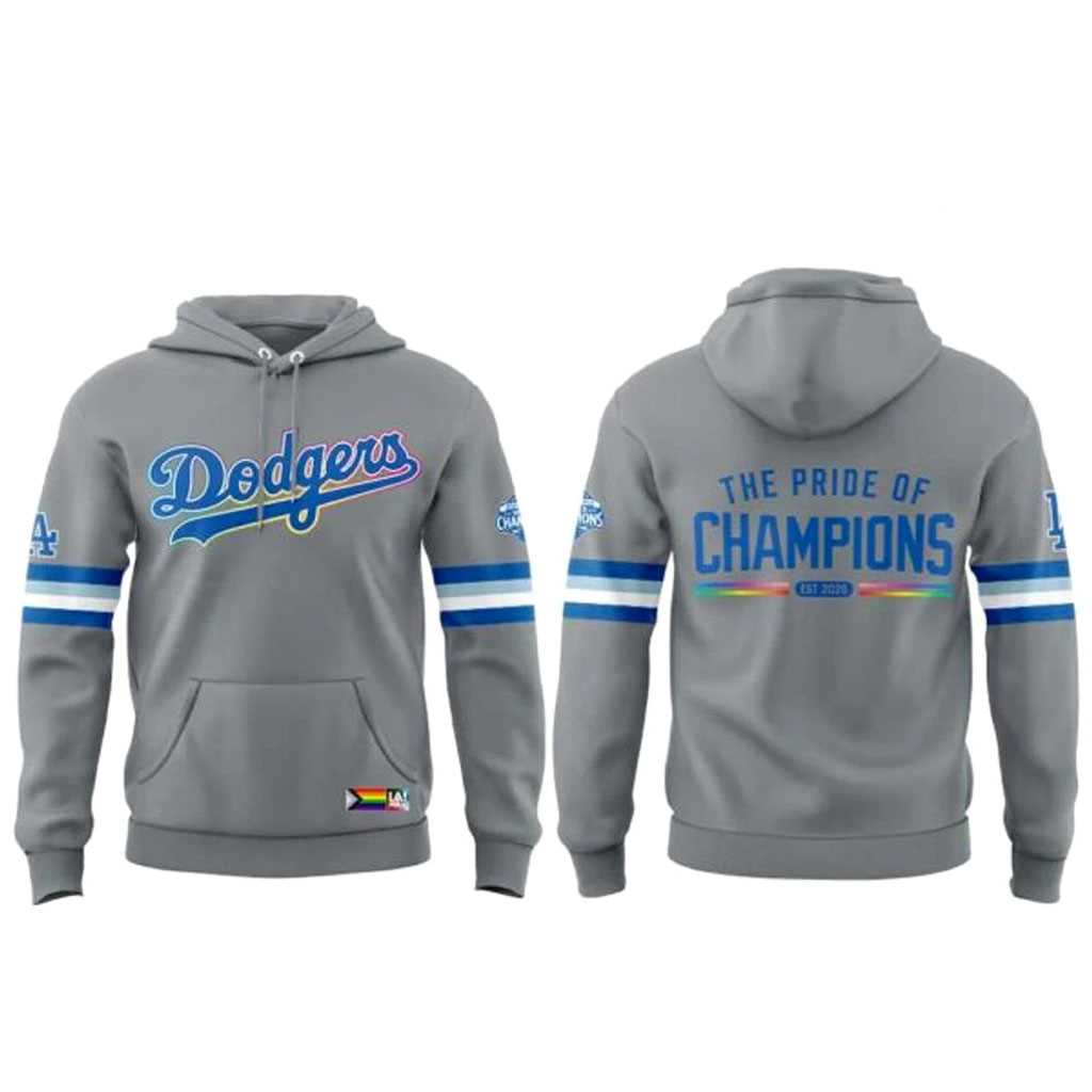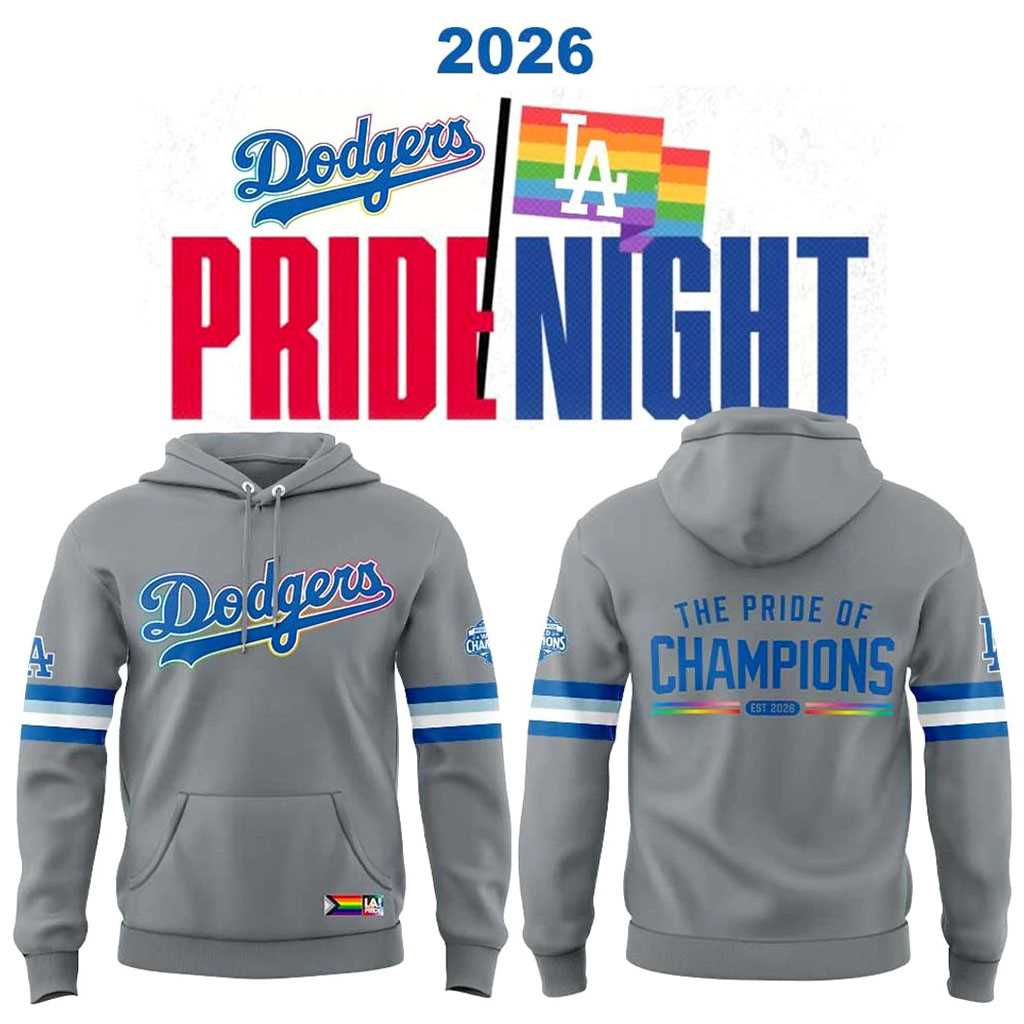 Show the world that love wins and everyone is welcome at the ballpark with the Los Angeles Dodgers Pride Night 2026 Hoodie, a vibrant celebration of inclusion.This hoodie features a sophisticated heather-grey base that allows the bold rainbow-themed Dodgers logo to truly shine. The “Dodgers” script is rendered in a beautiful spectrum of colors, while the sleeve features the “Pride of Champions” branding alongside the progressive Pride flag. The back is clean and modern, featuring a small, colorful logo near the collar that adds a subtle touch of support to this powerful and meaningful design.Constructed with eco-friendly recycled polyester and organic cotton, this hoodie is as sustainable as it is stylish. The interior is lined with a cozy French terry fabric that provides warmth without the weight, making it perfect for year-round wear. It’s more than just fan gear; it’s a statement of solidarity and a reminder that the Dodgers family includes everyone, regardless of who they love.Wear your pride with the Blue! Buy your Los Angeles Dodgers Pride Night 2026 Hoodie today and join the celebration of diversity!