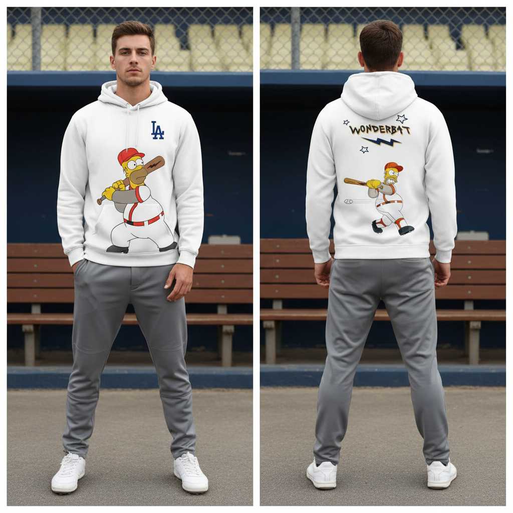 Unleash your inner slugger with the hilarious Los Angeles Dodgers The Simpsons 2026 Night Shirt Hoodie! This unique design perfectly merges Springfield’s favorite dad with America’s pastime. The front prominently features Homer Simpson in a classic white Dodgers-style baseball uniform with red trim and cap, poised with his bat, ready to hit a dinger, all beneath the iconic blue LA Dodgers logo. Flip it around, and the back showcases Homer mid-swing, the ball a blur of motion, crowned by the legendary ‘WONDERBAT’ text in yellow and black, underlined by a striking blue lightning bolt and whimsical star outlines. It’s a playful tribute to a timeless Simpsons episode, celebrating both baseball fandom and animated comedy in vibrant detail.