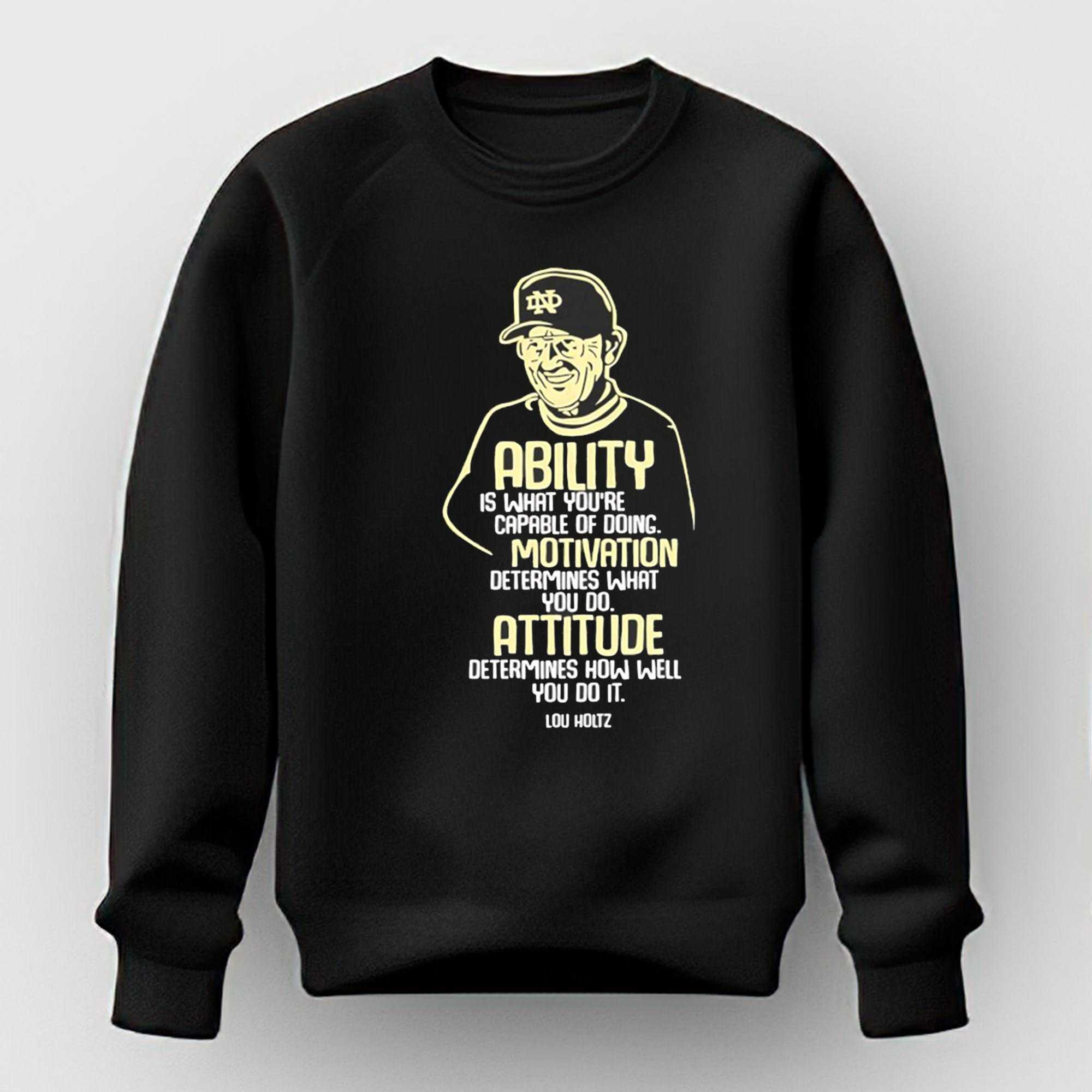 Channel the legendary wisdom of a coaching icon with the Lou Holtz Notre Dame Fighting Irish Ability Motivation Attitude Tee. This design features one of the most powerful quotes in sports history, meticulously laid out in an authoritative, collegiate-style font. The text breaks down the pillars of success: “Ability is what you’re capable of doing. Motivation determines what you do. Attitude determines how well you do it.” It is a visual manifesto for anyone who values grit, leadership, and the relentless pursuit of excellence, framed by the iconic Leprechaun mascot and the prestigious gold and navy of Notre Dame.