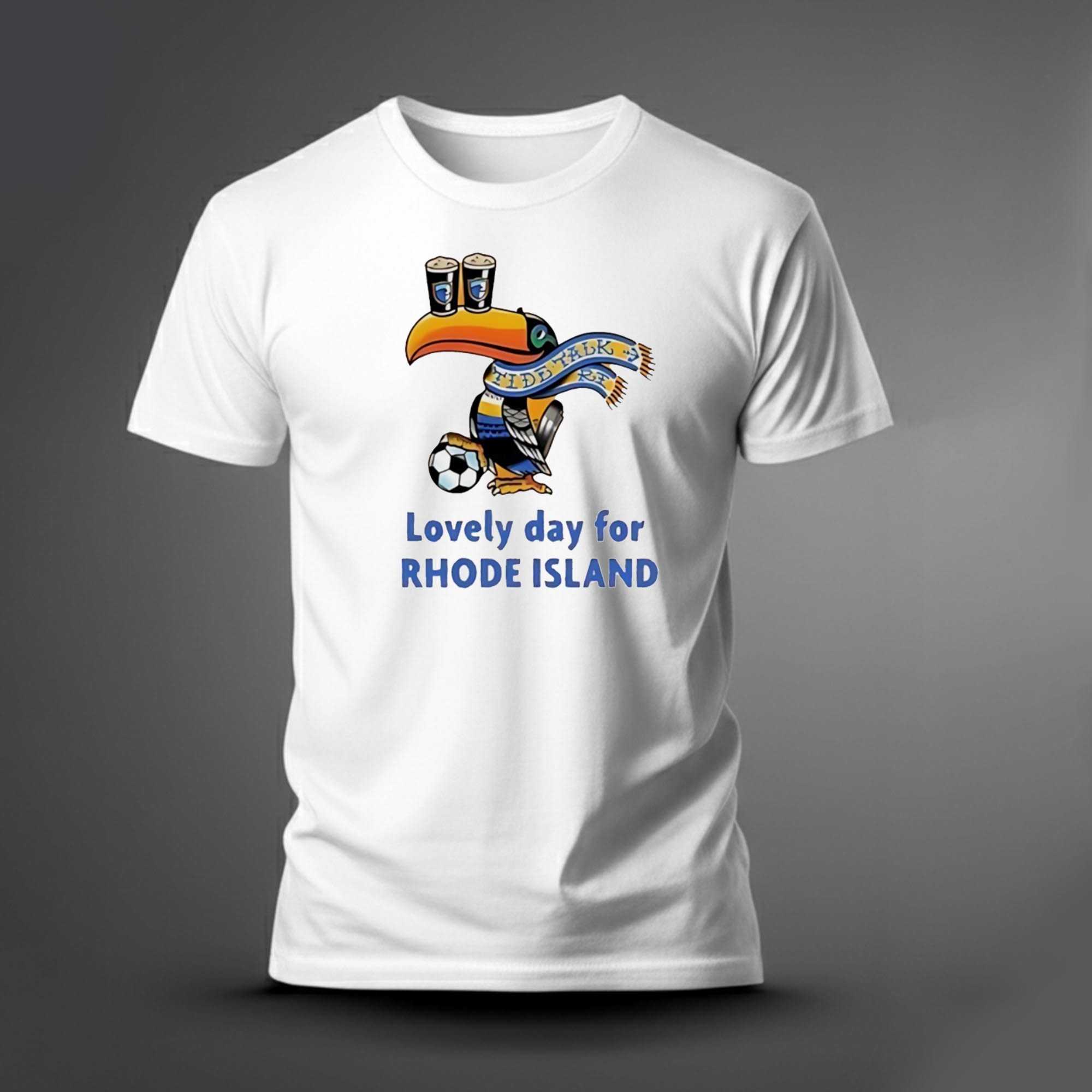 Kick off your love for the Ocean State in style with our Lovely Day For Rhode Island Tee! This whimsical design stars a vibrant, cheerful toucan, sporting an orange beak and colorful blue, yellow, and black plumage. Perched humorously on its head are two frothy pint glasses of dark beer, complete with a distinctive blue shield logo, while a blue and yellow scarf bearing “TIDETALK RI” and anchor motifs wraps around its neck. Completing the scene, the toucan proudly clutches a black and white soccer ball. Below this playful avian, bold blue text declares “Lovely day for” in a lighter shade, followed by “RHODE ISLAND” in darker, more prominent lettering, capturing the laid-back, celebratory spirit of the state – perfect for anyone who enjoys good times, local pride, and a touch of quirky charm.