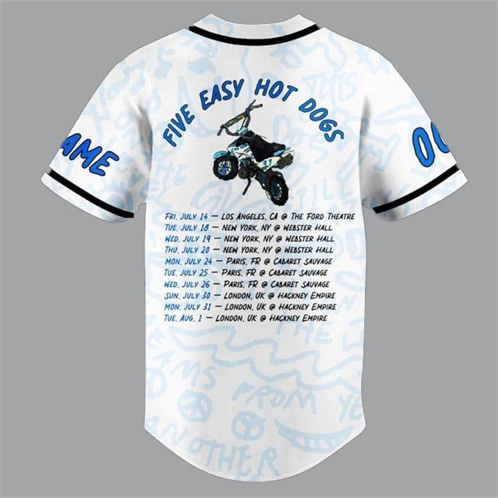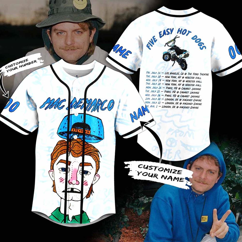 - Introducing the Mac Demarco Five Easy Hot Dogs Custom Baseball Jersey , the perfect addition to any fan’s collection! .If you’re a fan of Mac DeMarco, then the Five Easy Hot Dogs Custom Baseball Jersey is an absolute must-have for your wardrobe. This unique piece not only showcases your love for the artist but also stands out with its playful design that captures the essence of Mac’s laid-back vibe. Imagine wearing this jersey at a concert or while hanging out with friends; it’s sure to spark conversations and turn heads.