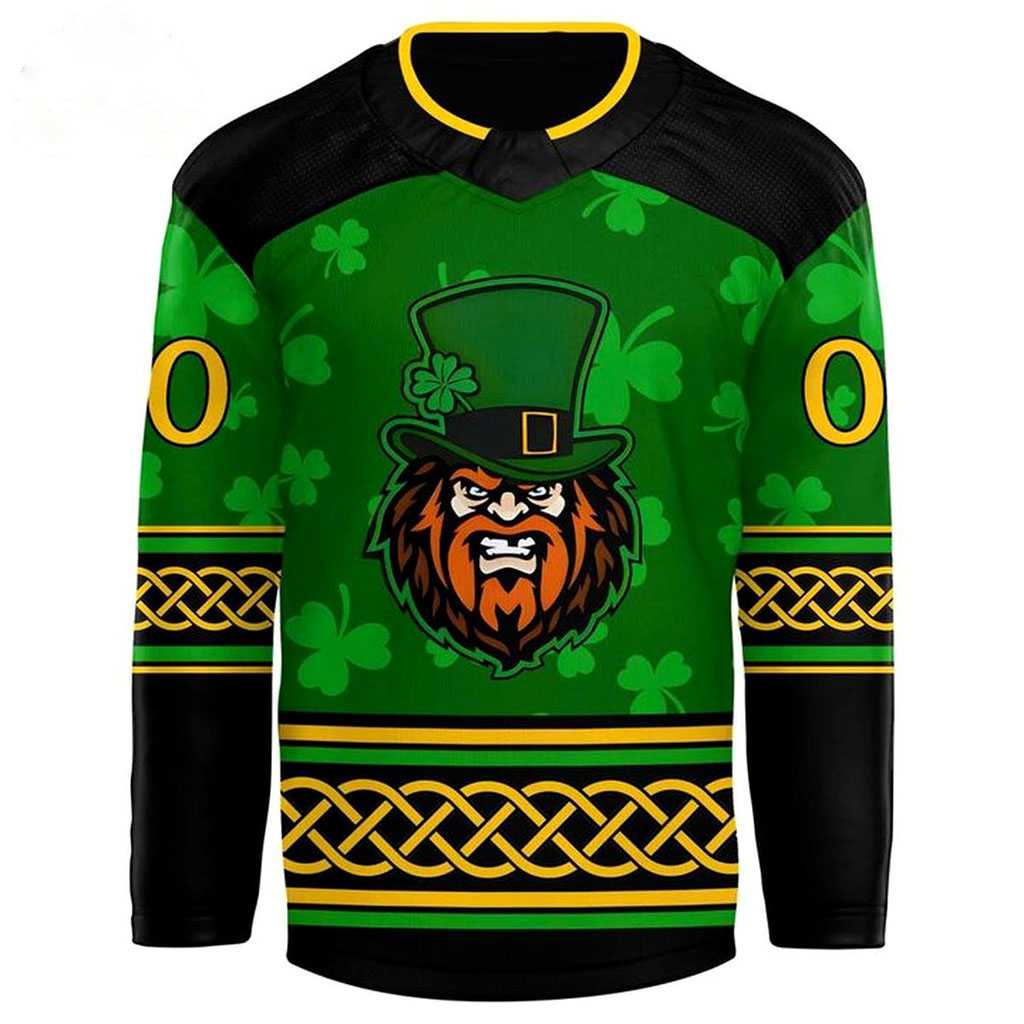 Get ready to sham-rock the rink with the “Macon Mayhem Celebrate StPatrick’s Day 2026 Jersey”! This strikingly festive design features a vibrant green base, subtly patterned with lucky shamrocks, that perfectly sets the stage for its fierce mascot. Front and center, a formidable leprechaun with a fiery red beard and a buckled top hat glares out, embodying both Irish charm and hockey grit. Celtic knotwork in striking gold and black adorns the sleeves and waistband, providing a rich, authentic touch. With bold yellow “00” numbers on the shoulders and a customizable “ANY NAME” over larger “00” numbers on the back, this jersey hilariously blends St. Patrick’s Day spirit with undeniable team power, ensuring you’re ready for any battle on or off the ice.