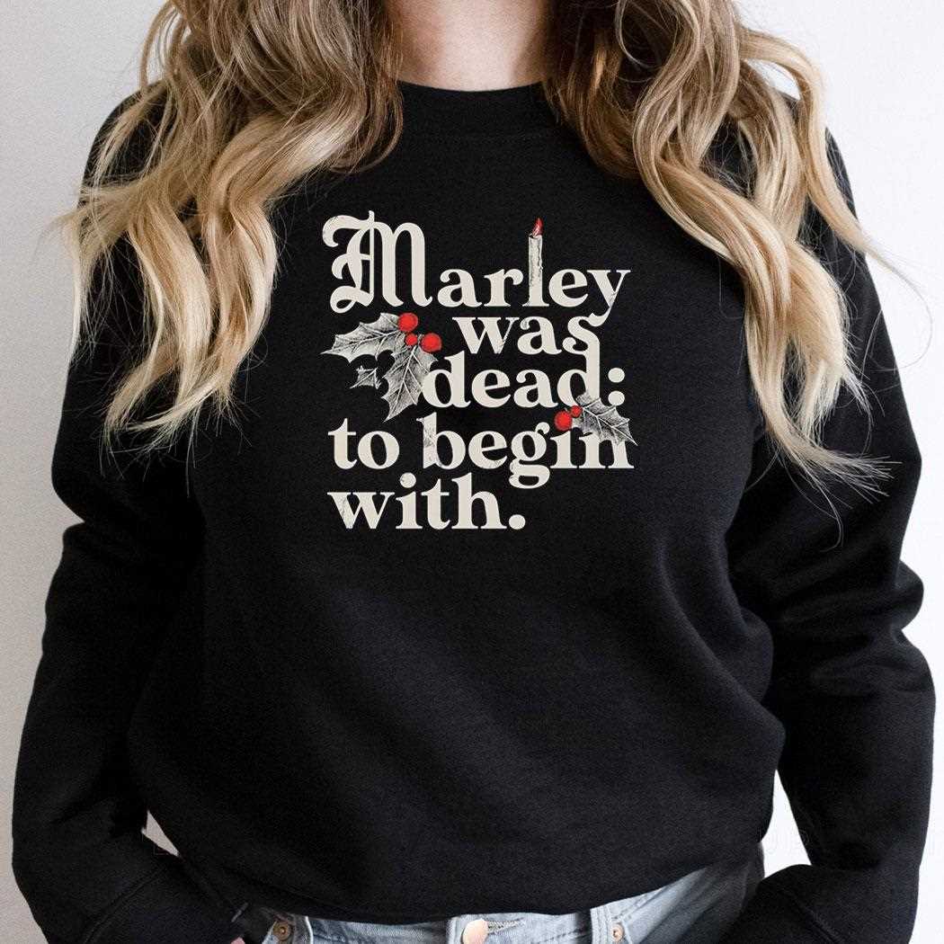 A gothic and literary design perfect for the Christmas season for those who prefer Dickens to Santa. The shirt features the famous opening line from A Christmas Carol: “Marley was dead: to begin with.” The text is written in a spooky, Victorian-style serif font, surrounded by ghostly chains and perhaps a faint silhouette of a door knocker transforming into a face. The monochromatic white-on-black scheme emphasizes the ghostly, somber, yet classic nature of the story. It’s a sophisticated nod to literature that works as a subtle holiday shirt.