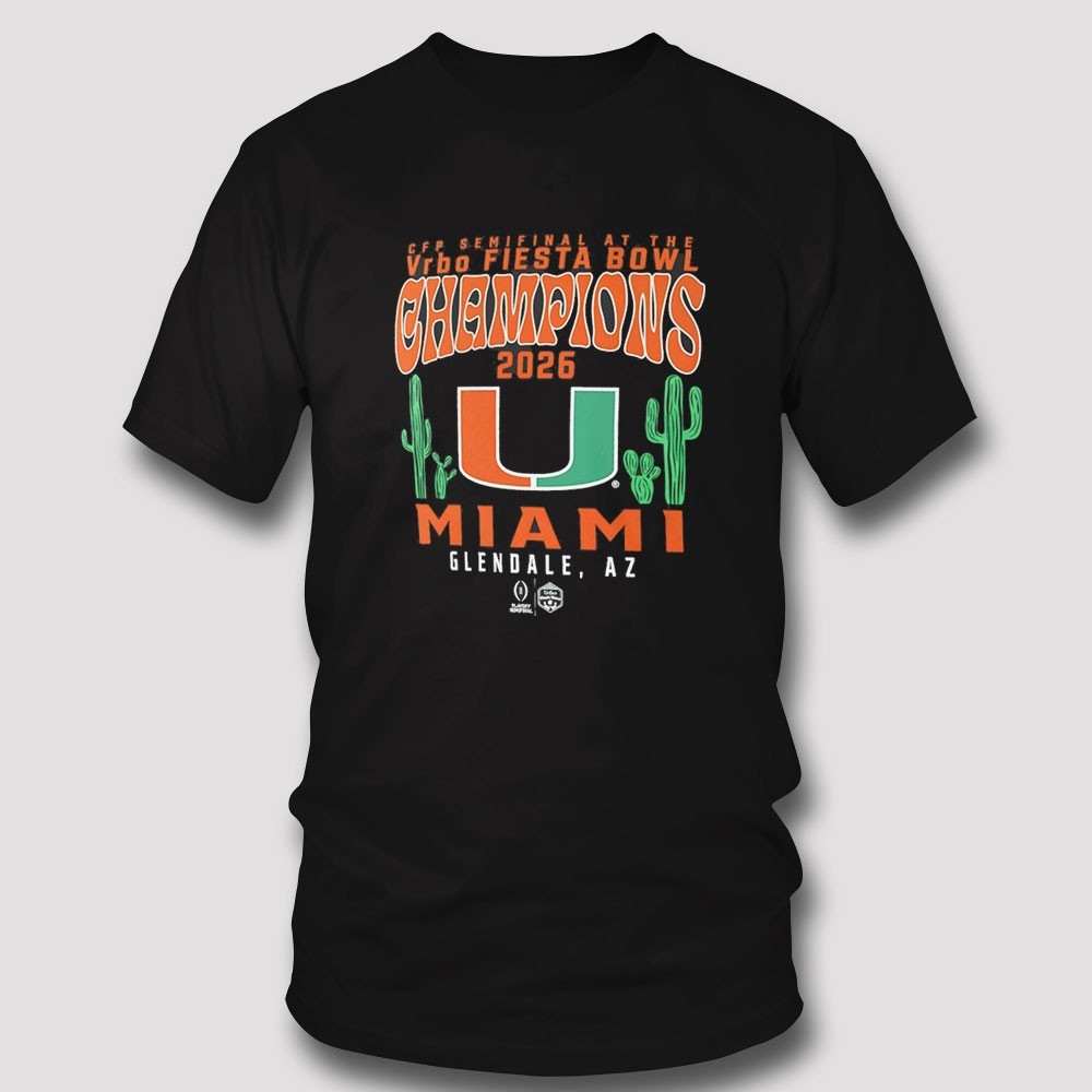 This sleek black t-shirt captures the raw energy of the 2026 College Football Playoff journey. Specifically designed for the ultimate supporter, the graphic features a bold “Champions” headline in a collegiate-style font that commands respect. Below, the legendary Miami Hurricanes branding is integrated with the official Fiesta Bowl logo, symbolizing the team’s dominance on the national stage. The high-contrast color palette of orange, green, and white stands out sharply against the dark fabric, making it a perfect choice for game days at Hard Rock Stadium. Crafted with a seamless collar and reinforced shoulders, this tee is built to last through every celebratory roar. It represents the grit, heart, and determination of a squad that refused to back down in Glendale. Immortalize the victory and wear your colors with pride—order your Miami Hurricanes College Football Playoff 2026 Fiesta Bowl Champions H… right now!.