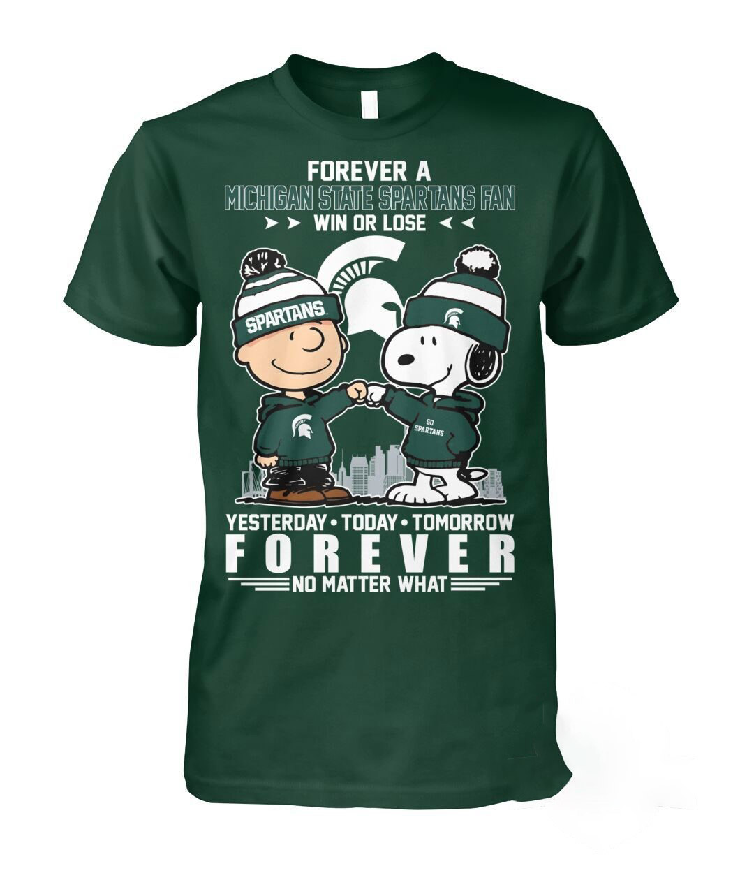 Show your unwavering team spirit with the Michigan State Spartans Snoopy And Charlie Brown Forever A Fan Shirt! This charming forest green tee perfectly captures the essence of true fandom, featuring beloved Peanuts characters Charlie Brown and Snoopy. Both are decked out in full Michigan State University gear, sporting green and white beanies, Spartan-logoed sweatshirts, and even a football helmet for Charlie Brown, while Snoopy proudly waves an MSU flag. They’re depicted in a spirited high-five, celebrating their shared allegiance. The design boldly declares “FOREVER A MICHIGAN STATE SPARTANS FAN WIN OR LOSE” above them, and “YESTERDAY – TODAY – TOMORROW FOREVER NO MATTER WHAT” below, embodying an enduring, nostalgic loyalty that resonates with every dedicated fan.