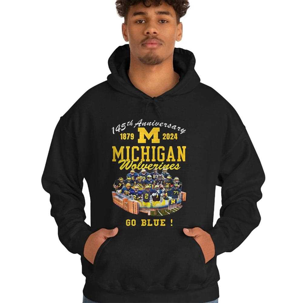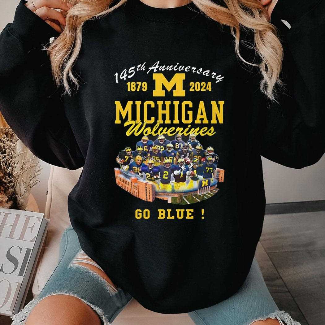 Honor nearly a century and a half of collegiate excellence with the Michigan Wolverines 145th Anniversary “Go Blue” Tee. This design is a sophisticated tribute to the rich history of the university, featuring a central “M” logo surrounded by celebratory text and a collage of historic moments and championships. The “145th Anniversary” branding is displayed prominently in a classic varsity font, accented with the dates 1879-2024. The iconic Maize and Blue color scheme is rendered with deep, saturated inks that pop against the professional navy background. This shirt is crafted from a high-performance cotton blend that offers both breathability for game days and a soft feel for everyday wear. Whether you’re a current student, a proud alumnus, or a lifelong fan, this piece of apparel allows you to wear 145 years of tradition on your chest. It’s a timeless design that celebrates the wins, the legends, and the enduring spirit of Ann Arbor. Be a part of the legacy—get your Michigan Wolverines 145th Anniversary Go Blue Tee today and shout Go Blue!. T-shirt !