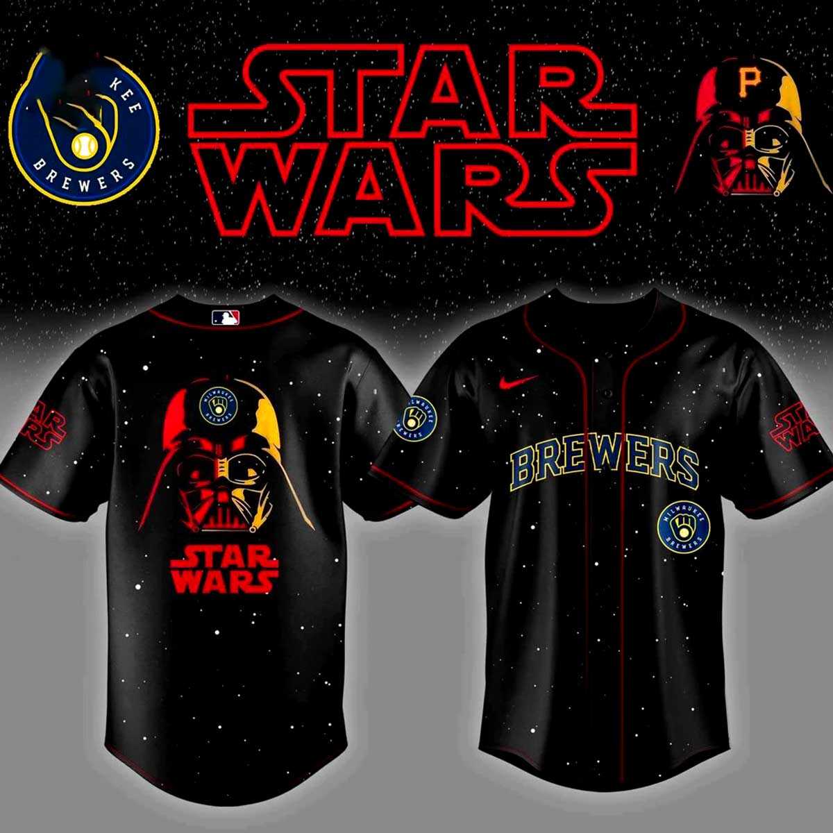 Prepare to join the dark side of the diamond with the Milwaukee Brewers Star Wars Darth Vader Edition Jersey! This captivating black jersey boasts a stellar space-themed backdrop, accented with striking red piping along the collar and sleeves. The front proudly displays “BREWERS” in a classic yellow and blue font, complemented by a smaller Brewers logo beneath, while a prominent red Star Wars logo adorns the left sleeve. The true force is on the back, where a colossal Darth Vader helmet, artfully redesigned with the iconic Milwaukee Brewers glove-and-ball logo integrated into its visor, stares out menacingly above the bold red “STAR WARS” text. This brilliant mashup humorously pledges allegiance to both the Empire and your favorite baseball team, letting you command attention whether you’re at the ballpark or traversing the galaxy.