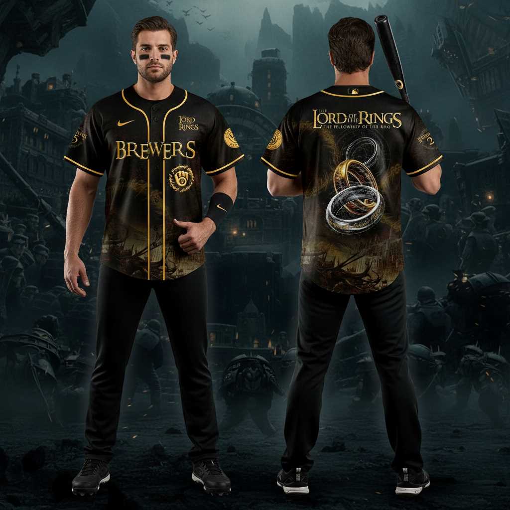 Unleash your inner fan with the “Milwaukee Brewers The Lord Of The Rings Baseball Jersey,” a masterful fusion where Middle-earth meets America’s favorite pastime. This unique black jersey commands attention with shimmering gold accents. The front proudly displays “LORD RINGS” above “BREWERS” and the iconic Brewers primary logo, all set against a dark, epic battle scene fading from the hem. Gold piping and sleeve stripes add a touch of regality. The back is equally stunning, featuring “THE LORD OF THE RINGS: THE FELLOWSHIP OF THE RING” logo, crowned by three intricately detailed rings—gold, silver, and the ominous One Ring—against the same dramatic battlefield backdrop. It’s a witty blend of epic quests and grand slams.