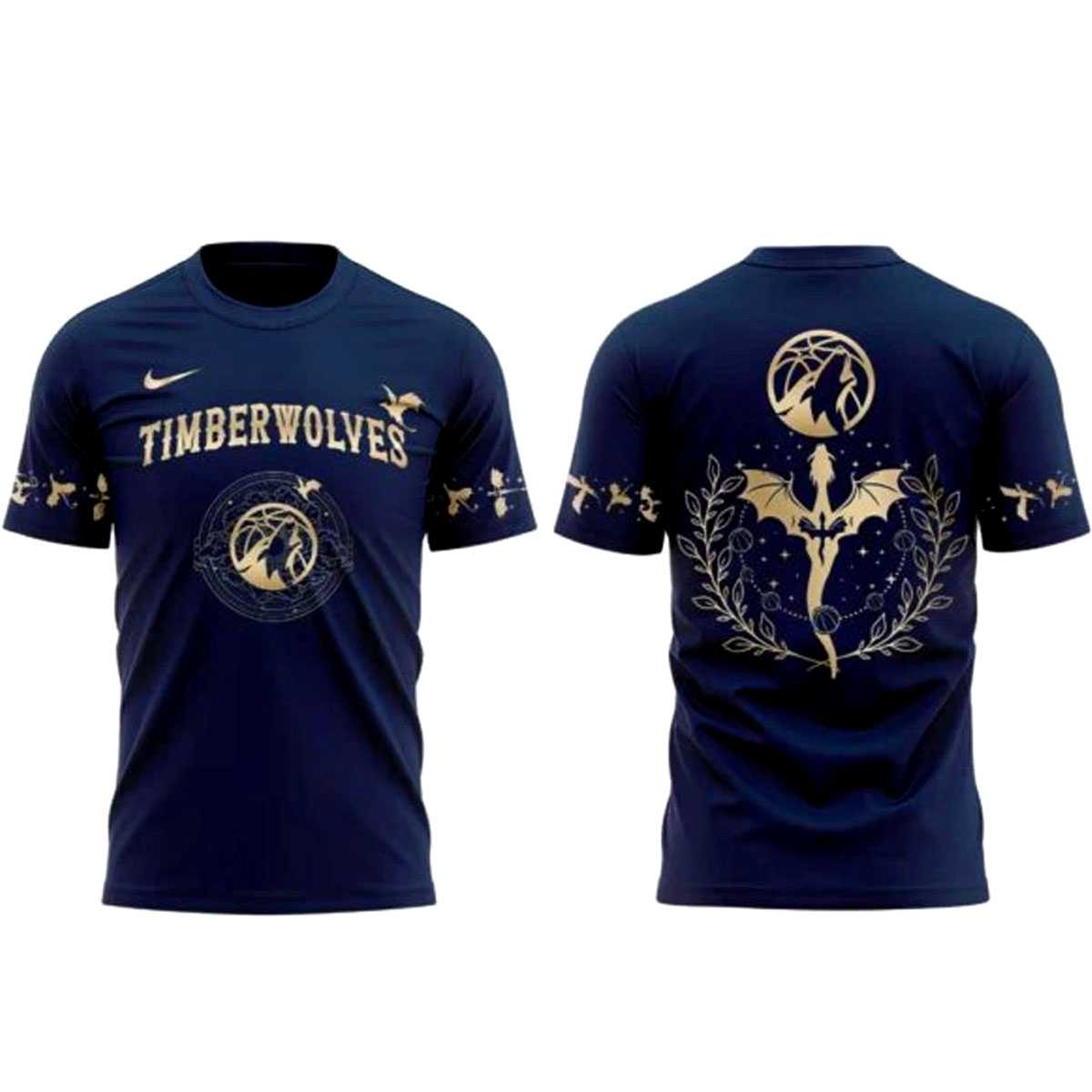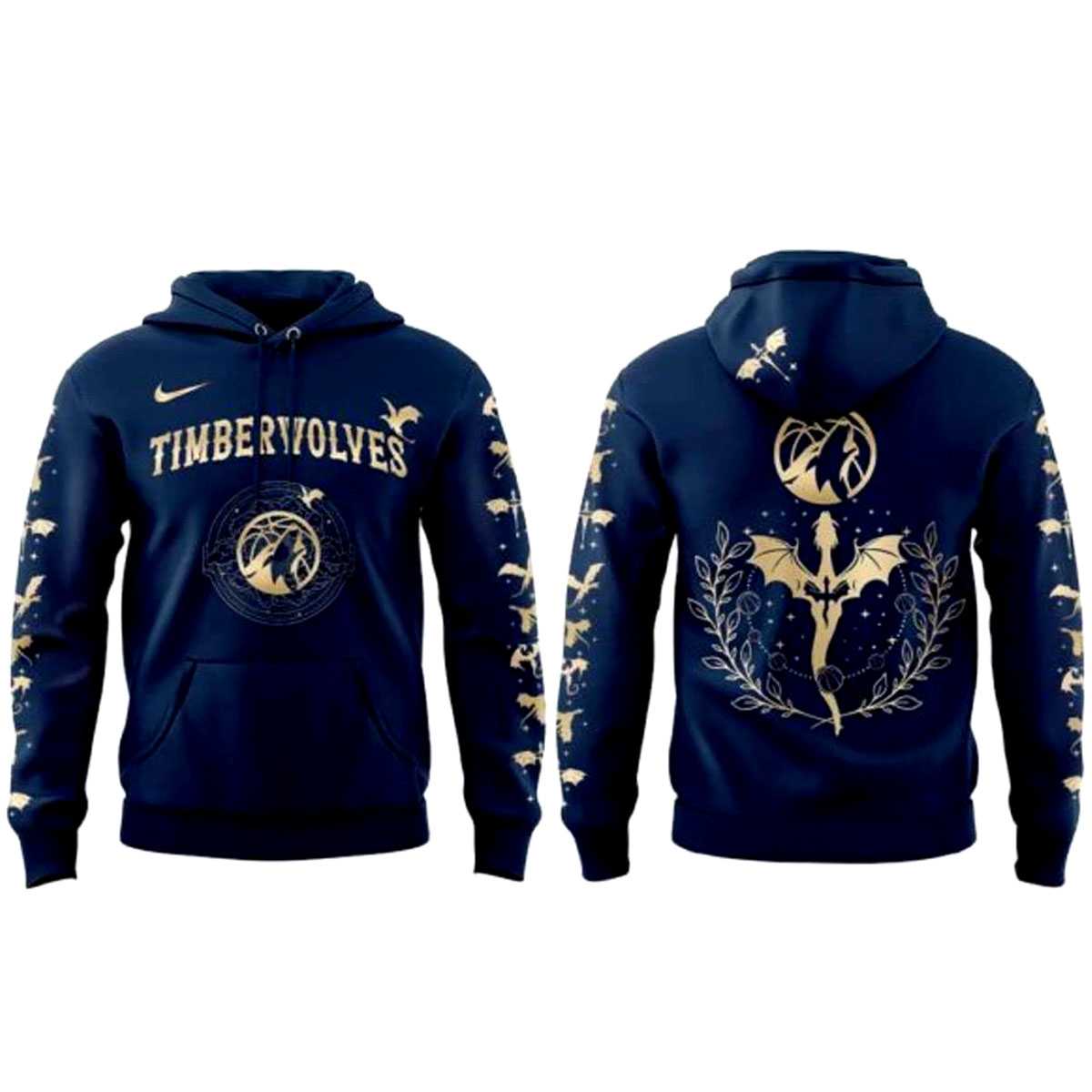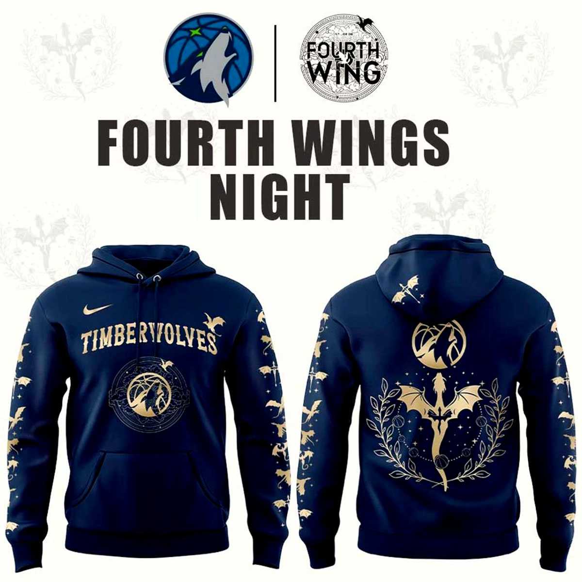 Unleash the beast within with the Minnesota Timberwolves Fourth Wings Night 2026 Hoodie. This captivating design takes the Timberwolves’ “Howl” and gives it a mythical upgrade. The hoodie features a deep navy base with striking gold and white accents, centered around a magnificent golden dragon that entwines with the classic wolf logo on the back, symbolizing ferocity and ancient power.
