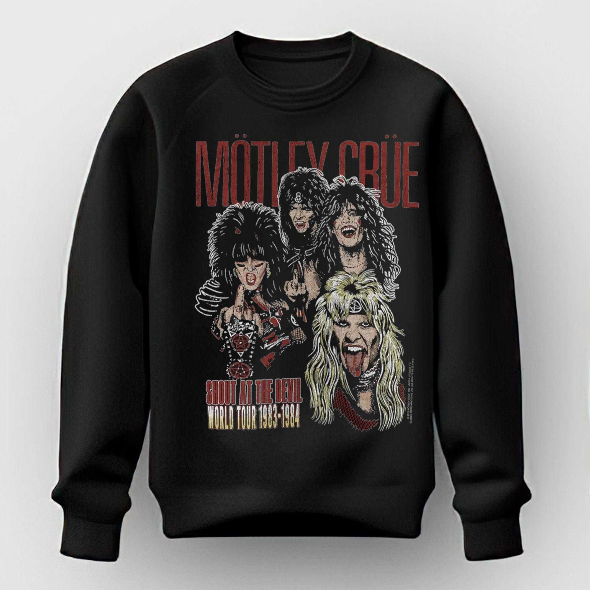 Unleash your inner rock god with the definitive Motley Crue Shout at the Devil Shirt! This electrifying design instantly transports you back to the infamous 1983-1984 World Tour, perfectly capturing the band’s notorious energy. Dominated by a gritty, distressed MÖTLEY CRÜE logo in dark red at the top, the design features a chaotic yet iconic cluster of the four band members. Witness Mick Mars defiantly flipping the middle finger, Nikki Sixx’s intense gaze, Tommy Lee’s signature wild grin, and Vince Neil’s uninhibited, tongue-out snarl, complete with his pentagram bandana. Their exaggerated white-outlined hair and raw expressions burst with the album’s dark, rebellious spirit, framed by the bold “SHOUT AT THE DEVIL WORLD TOUR 1983-1984” text in distressed red and gold. This visual feast is a vivid homage to an era that defined glam metal, celebrating their theatrical audacity.