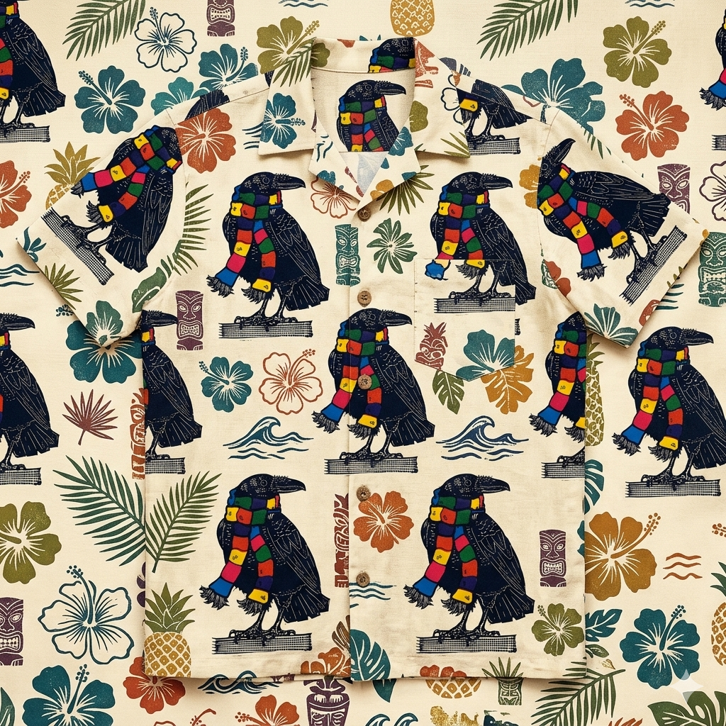 Unleash your inner rebel with a tropical twist in the Multicoloured Crow Hawaiin T-Shirt! This captivating design takes the classic Hawaiian aesthetic and infuses it with quirky charm. Against a creamy beige backdrop, a repeating pattern unfolds, showcasing numerous stylized black crows, each defiantly sporting a vibrant, multicoloured scarf in stripes of red, orange, yellow, green, blue, and purple. Interspersed among these fashionable fowl are playful elements of paradise: lush teal palm fronds, earthy brown and orange hibiscus flowers, cheerful golden pineapples, ancient-looking brown and green tiki masks, and dynamic blue ocean waves. The humor lies in the unexpected sophistication of these crows, bringing a witty, unconventional flair to an otherwise sunny scene, perfect for those who appreciate a unique blend of nature and abstract artistry.