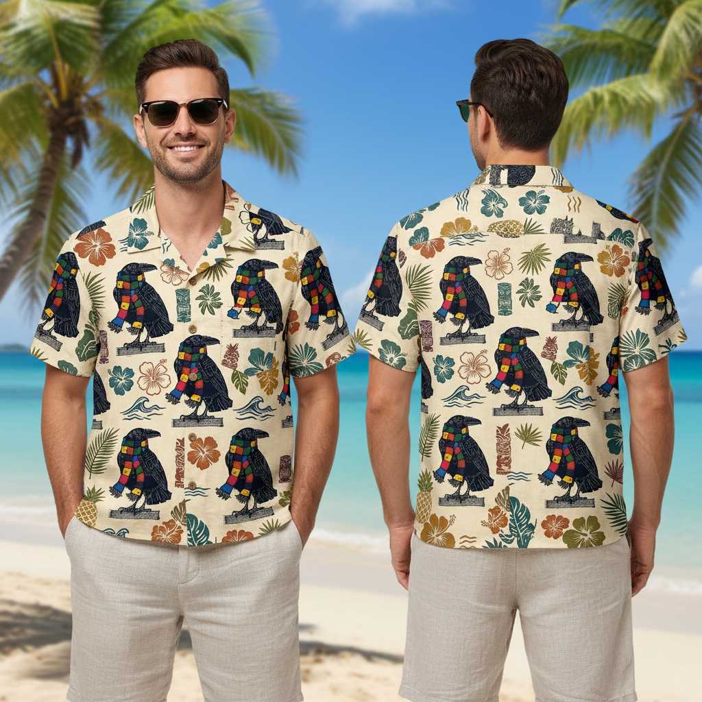 Crafted for ultimate comfort and enduring style, this premium shirt is made from a breathable, lightweight woven fabric that drapes effortlessly, keeping you cool as the temperatures rise. Its signature button-down tropical style offers a relaxed, airy fit, perfect for laid-back days or festive nights. Thanks to high-definition all-over printing technology, the vibrant, fade-resistant colors truly pop, ensuring that every intricate detail – from the subtle textures of the tiki masks to the bold hues of the crows’ scarves and the rich tones of the paradise-inspired pattern – is captured with stunning clarity, inviting compliments wherever you go.
