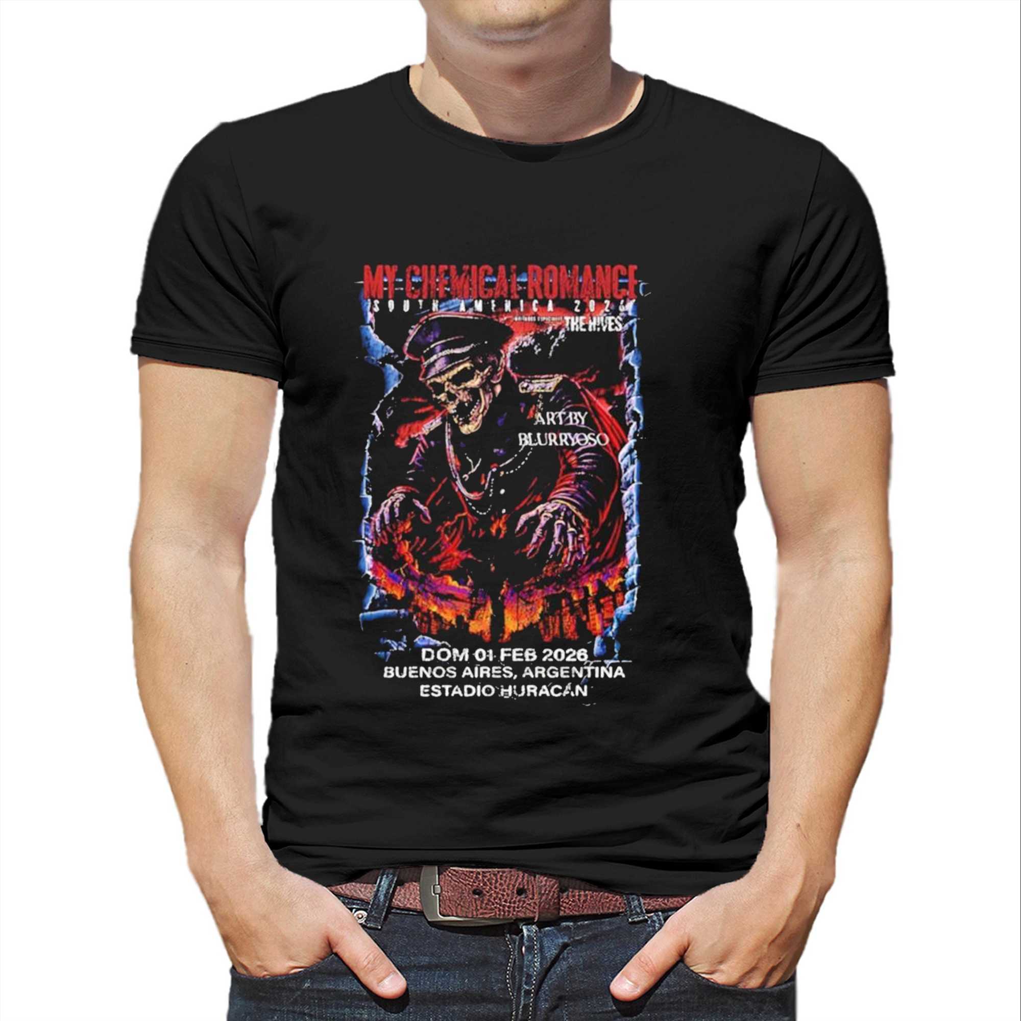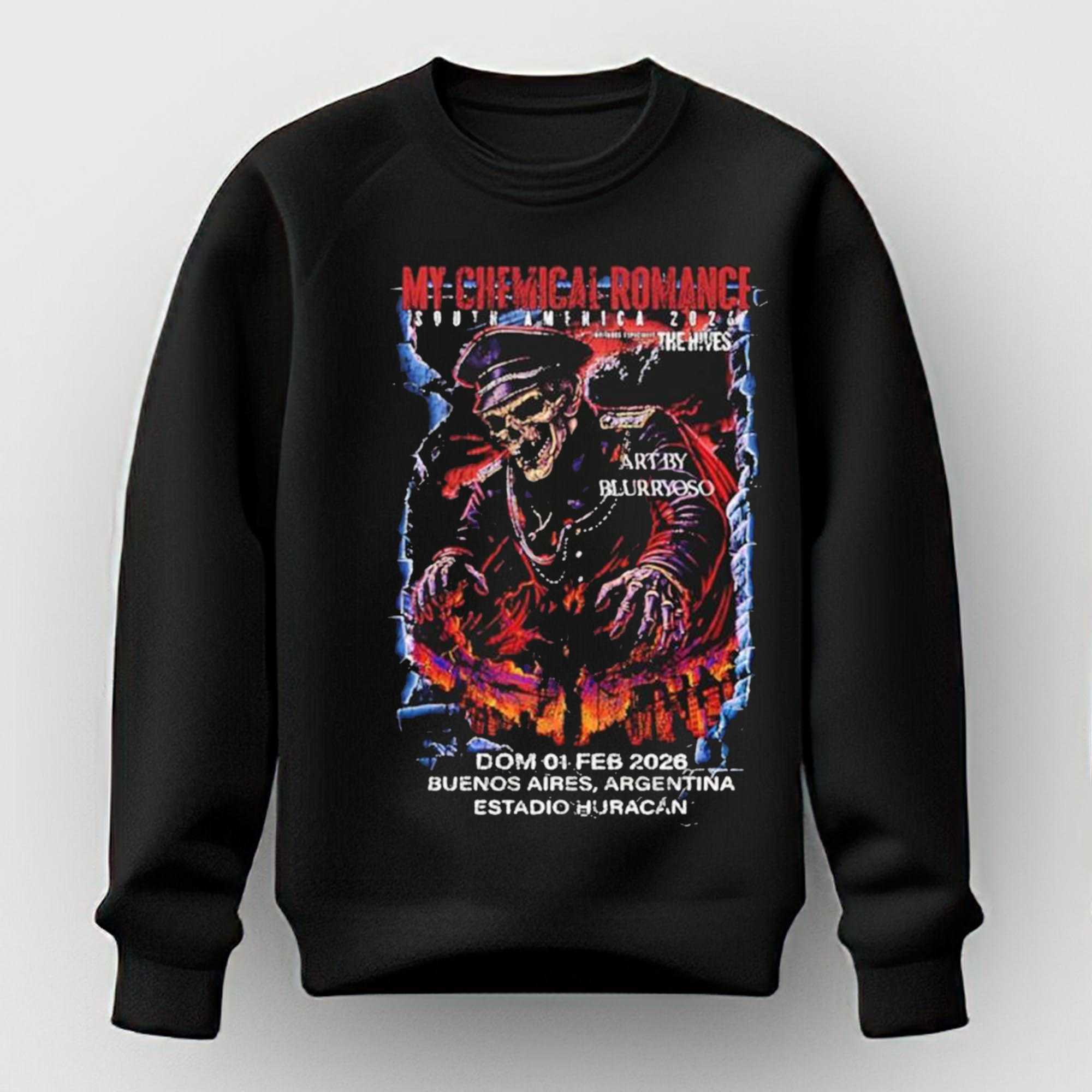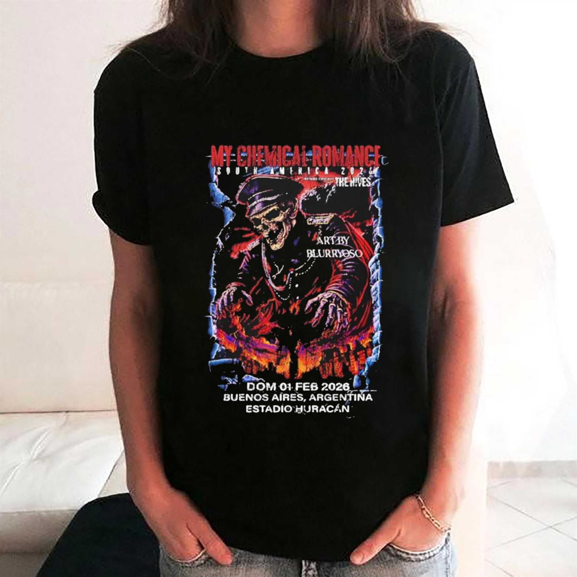 Embrace the theatricality and the uncompromising spirit of the “Killjoy” movement with the My Chemical Romance South America 2026 Shirt. This design is a stunning, high-octane tribute to the band’s journey through the southern hemisphere, featuring a massive graphic that blends the band’s signature “masked” imagery with a fiery, apocalyptic aesthetic. Centered on a detailed illustration of a demon-like figure, the artwork utilizes a vibrant palette of blood-red, orange, and blue to create a visual that is as powerful as an MCR anthem. The “South America 2026” branding is bold and modern, making this an essential memento for the fans who live for the “Black Parade.” This is a masterclass in alternative band merch, utilizing sharp typography and complex imagery to reflect the emotional depth of their lyrics. Set on a premium black cotton tee, the graphic provides a sleek, modern look that fits seamlessly into a contemporary urban wardrobe. The shirt is crafted from ultra-soft, ringspun cotton, offering a luxurious feel and a breathable fit that is perfect for live shows or casual hangouts. It pays tribute to the band’s ability to blend raw intensity with catchy, infectious rhythms. Show your appreciation for the kings of the emo scene and represent the best in the business. Secure your place in the crowd and buy the My Chemical Romance South America 2026 Shirt today!.