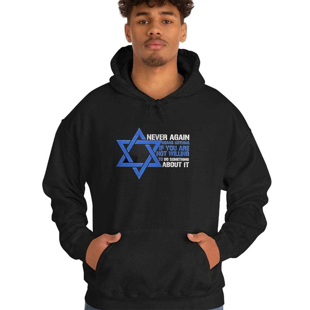 A powerful and essential message for our times. This t-shirt features the Star of David with the solemn reminder, “NEVER AGAIN MEANS NOTHING IF YOU ARE NOT WILLING TO DO SOMETHING ABOUT IT.” It’s a call to action against antisemitism and a promise to never forget. Stand in solidarity. This is more than a shirt; it’s a commitment to fighting hate in all its forms. Get yours and make your voice heard..