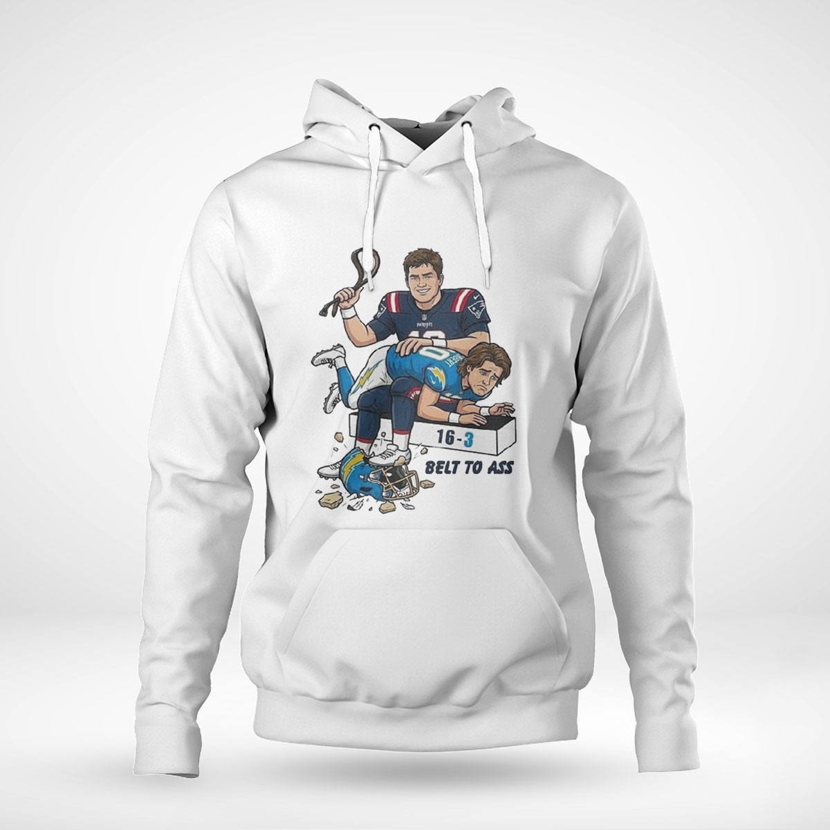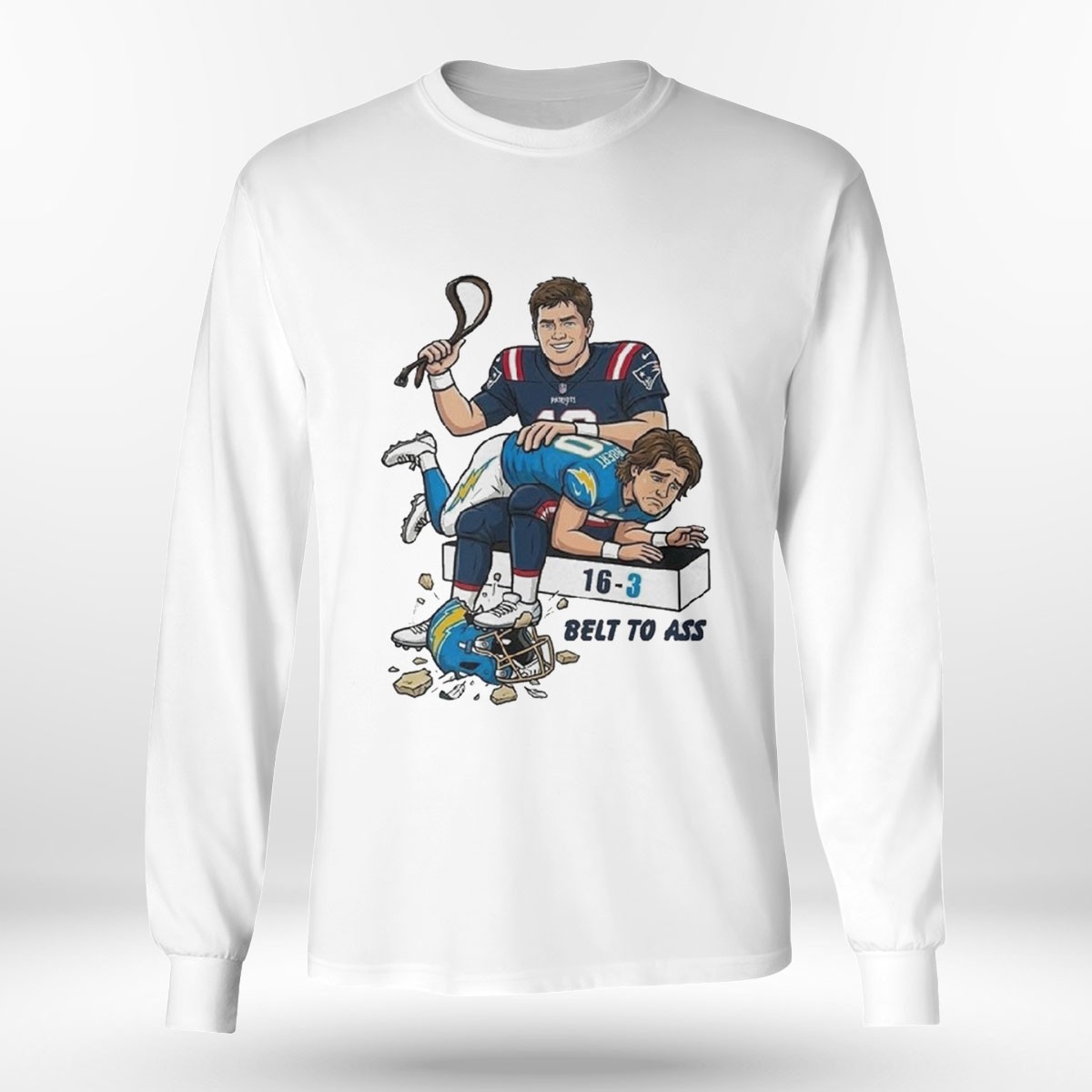 Celebrate a dominant divisional victory with the “New England Patriots Belt To Ass” commemorative tee. This design highlights the historic 16-3 scoreline, featuring a humorous and high-energy graphic that captures the feeling of a hard-fought win. The artwork utilize the iconic Patriots blue and silver in a sharp, athletic layout that is perfect for any Foxborough faithful. Made from a high-grade, pre-shrunk cotton fabric, this shirt provides a reliable and comfortable fit for those cold New England winters or celebratory summer parades. The premium screen print is designed to stay vibrant, ensuring the memory of the win remains clear for years. It’s a fun, lighthearted way to show your team spirit and have a laugh at the competition’s expense. Represent the dynasty and the defense that held the line. Commemorate the big win and represent the red, white, and blue—buy the New England Patriots Belt To Ass 16-3 Tee today!.