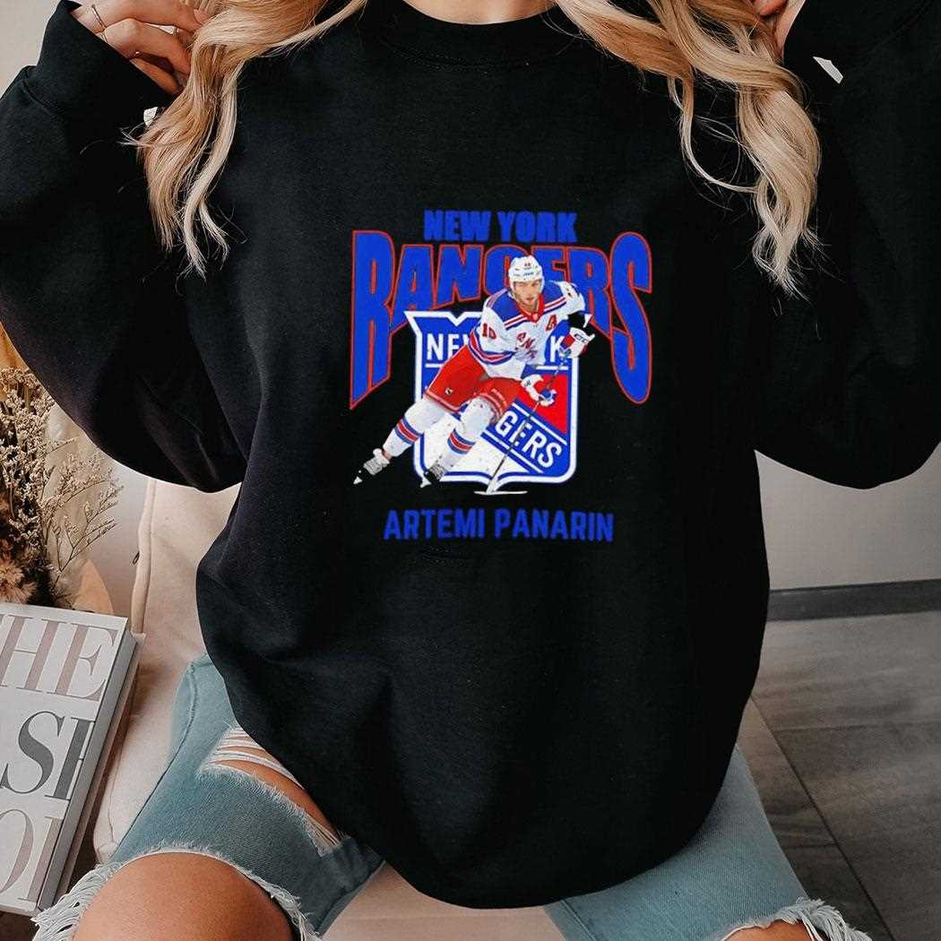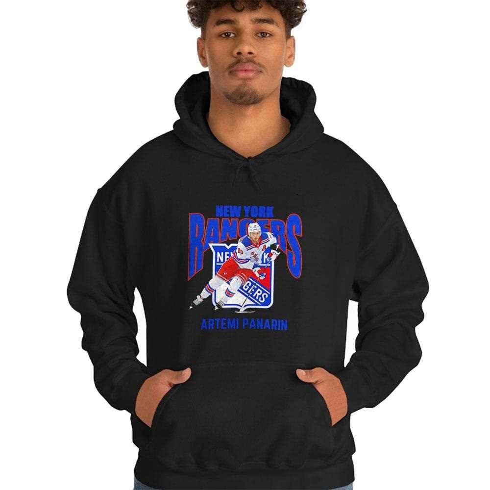 Support the “Breadman” as he leads the Rangers into the postseason. This shirt features a dynamic image of Artemi Panarin in his Rangers blue, celebrating a goal with his signature high kick leg kick. The background includes the Rangers shield and stylized text, capturing the excitement of playoff hockey at Madison Square Garden. The design focuses on speed, skill, and the electric atmosphere of New York hockey. Cheer for the Blueshirts and get your New York Rangers Artemi Panarin Ice Hockey Playoffs Tee before the puck drops!. T-shirt !