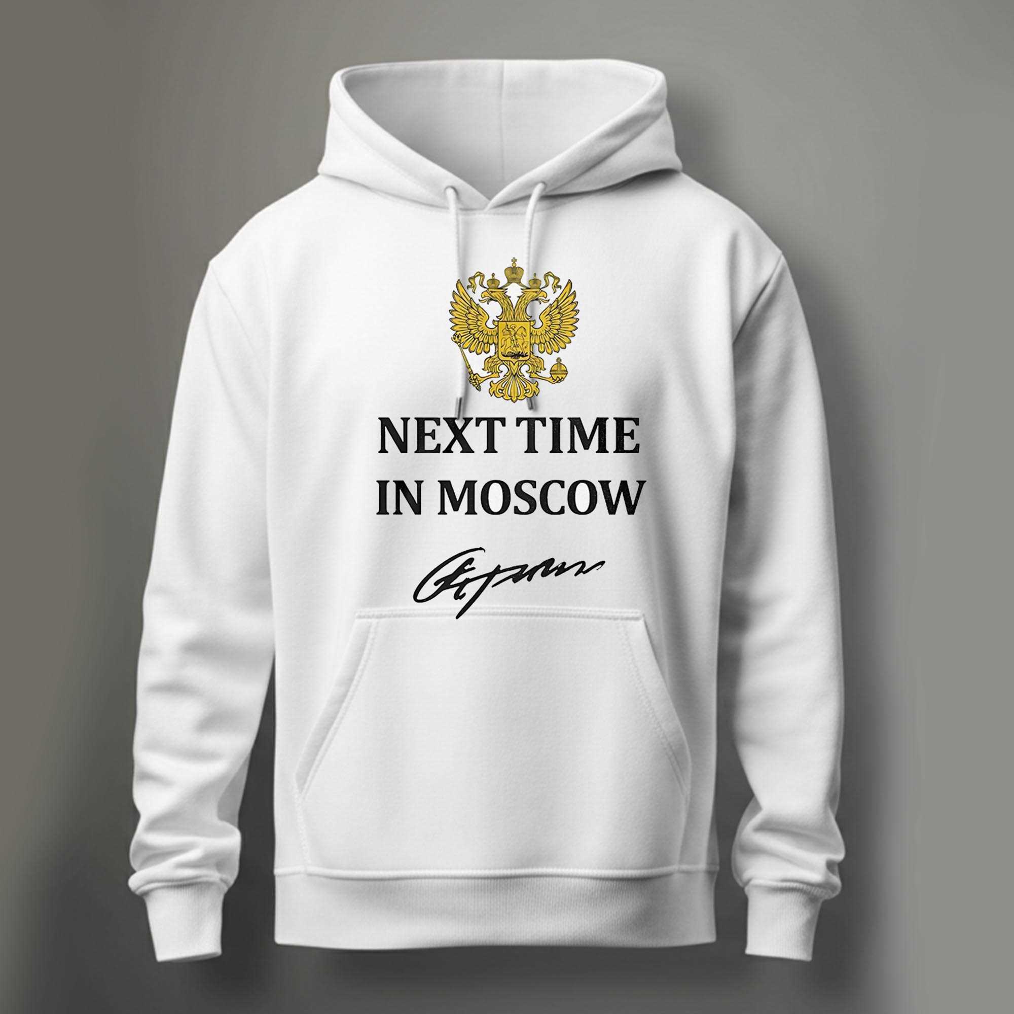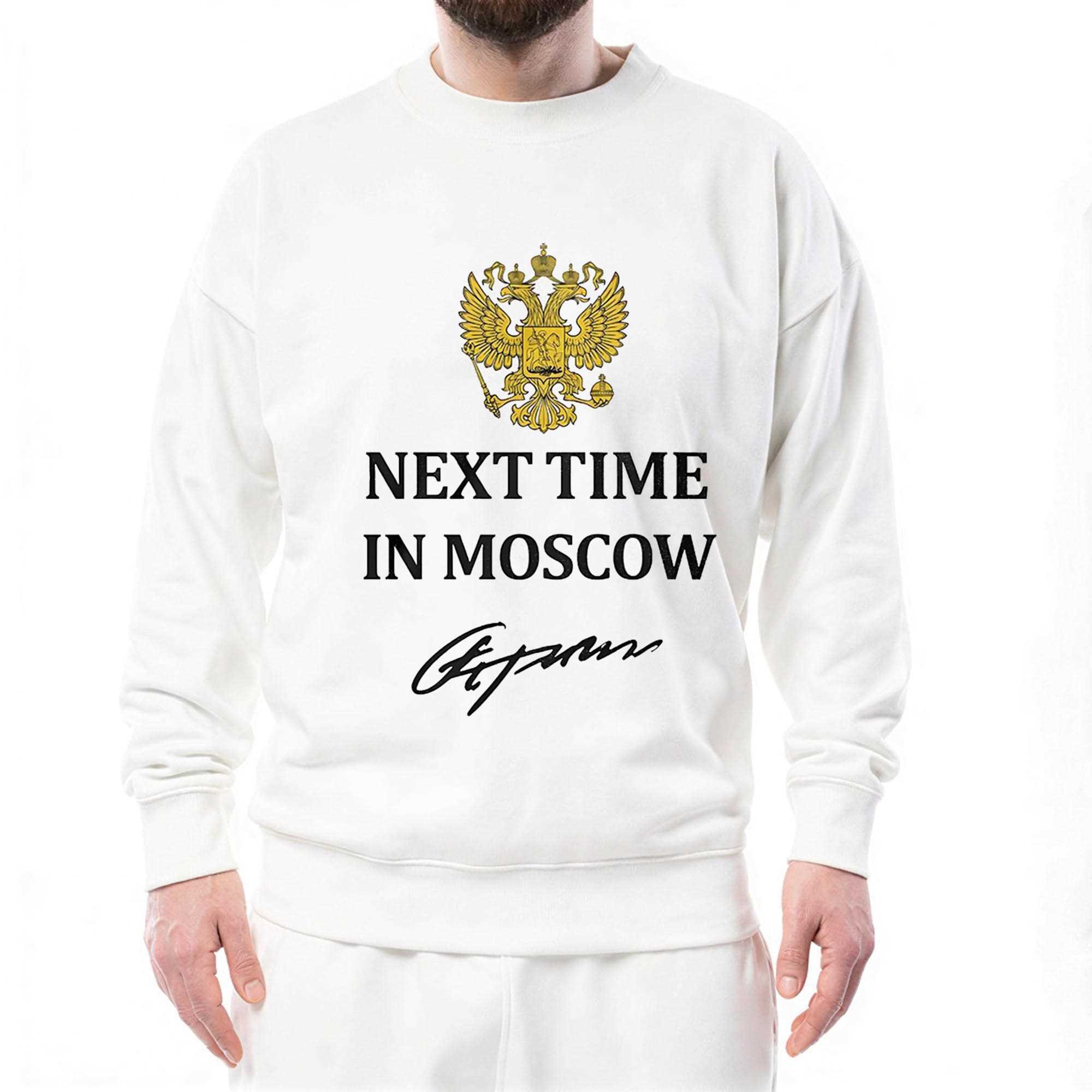 The shirt showcases an elegant cursive script of “Next Time in Moscow,” accompanied by a stylized signature that suggests a specific cultural connection or an upcoming artistic event. It’s a masterclass in “less is more” design, perfect for those who prefer a professional and polished look over loud graphics. It captures the curiosity of the world traveler.