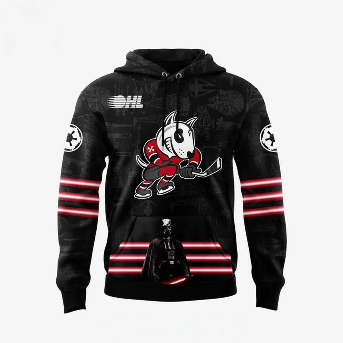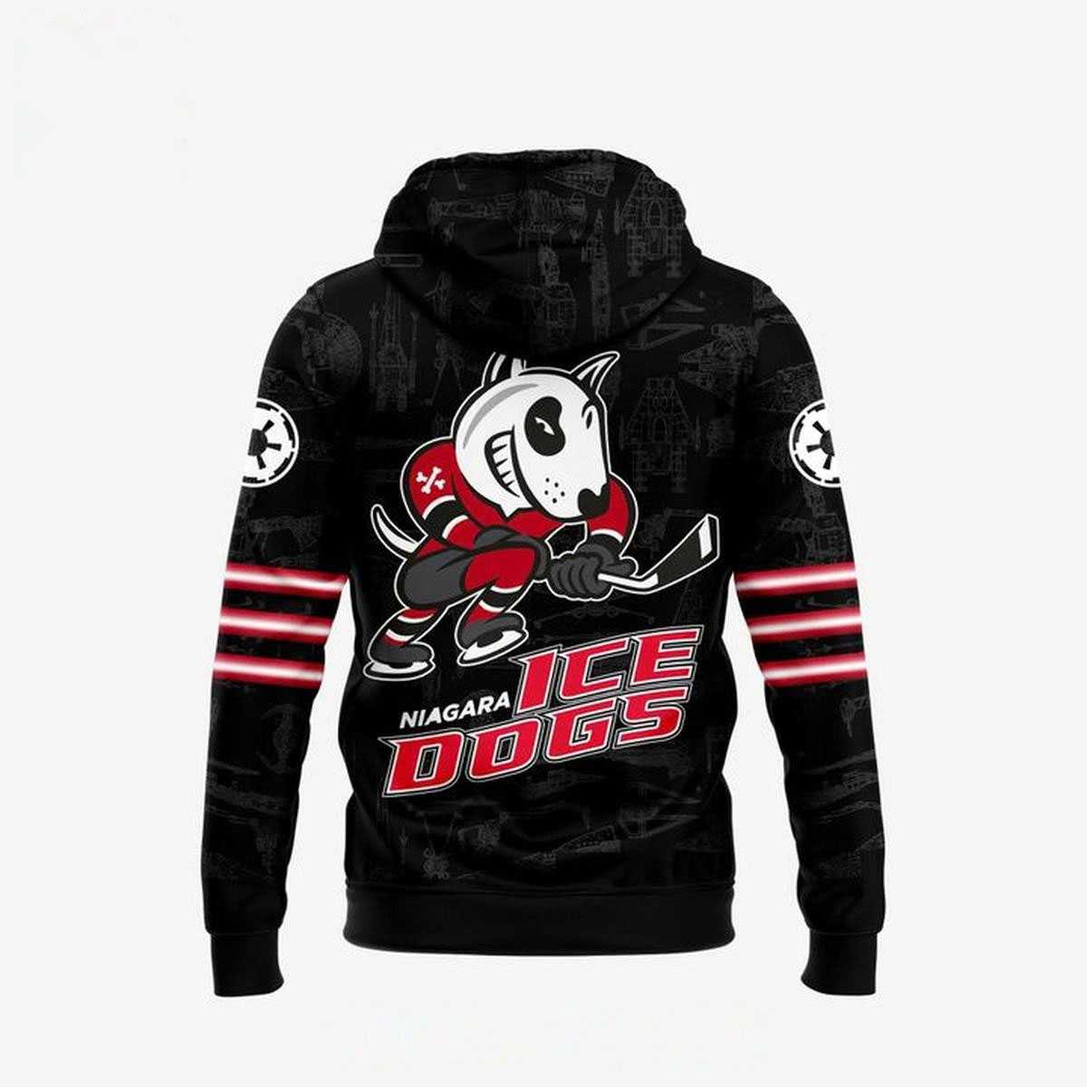 Prepare to join the Empire on the ice with the Niagara Ice Dogs Star Wars Night 2026 Dark Side Hoodie T- Shirt! This uniquely humorous design showcases a determined white bull terrier, sporting distinctive black panda-like patches around its eyes – a nod to the Dark Side – dressed in a fierce red and black hockey uniform, stick in paw, ready to hit the ice. The background features a subtle yet menacing black-on-black pattern of iconic Star Wars Imperial vehicles like TIE Fighters and Star Destroyers, complemented by stark white Imperial cog symbols prominently displayed on the shoulders. With red and white stripes adorning the sleeves in classic hockey jersey fashion, and the “OHL” logo on the front chest and “Niagara Ice Dogs” proudly emblazoned on the back, this design masterfully blends the competitive spirit of hockey with the galactic might of the Empire, creating a truly unforgettable and witty tribute for fans of both universes.