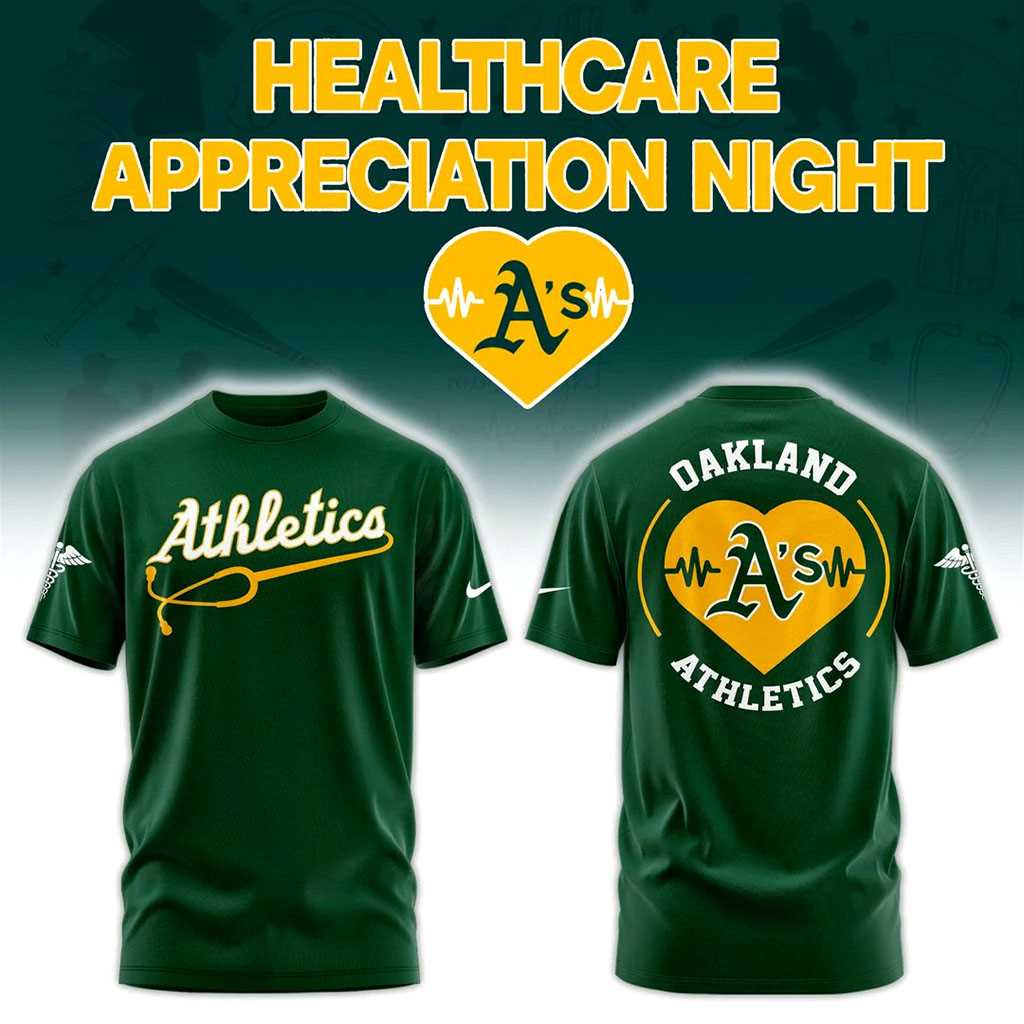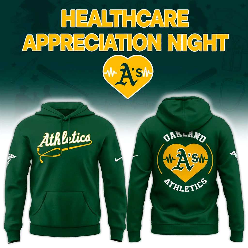 Celebrate the unwavering spirit of healthcare heroes and your beloved team with the Oakland Athletics Healthcare Appreciation Night Hoodie. This vibrant dark green hoodie cleverly blends athletic pride with medical appreciation. The front showcases “Athletics” in bright yellow script, playfully underlined by a baseball bat-like swoosh, while a distinct white caduceus symbol graces the left sleeve. Turn around to reveal a powerful statement on the back: a large yellow heart, elegantly outlined by a subtle white electrocardiogram (ECG) line, encircles the iconic ‘A’s’ logo. Above and below, “OAKLAND” and “ATHLETICS” are proudly displayed in white, completing a heartfelt tribute that uniquely honors both passions.