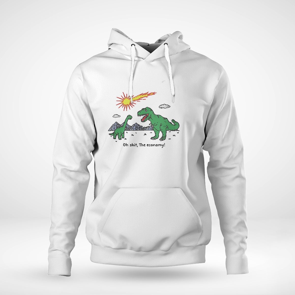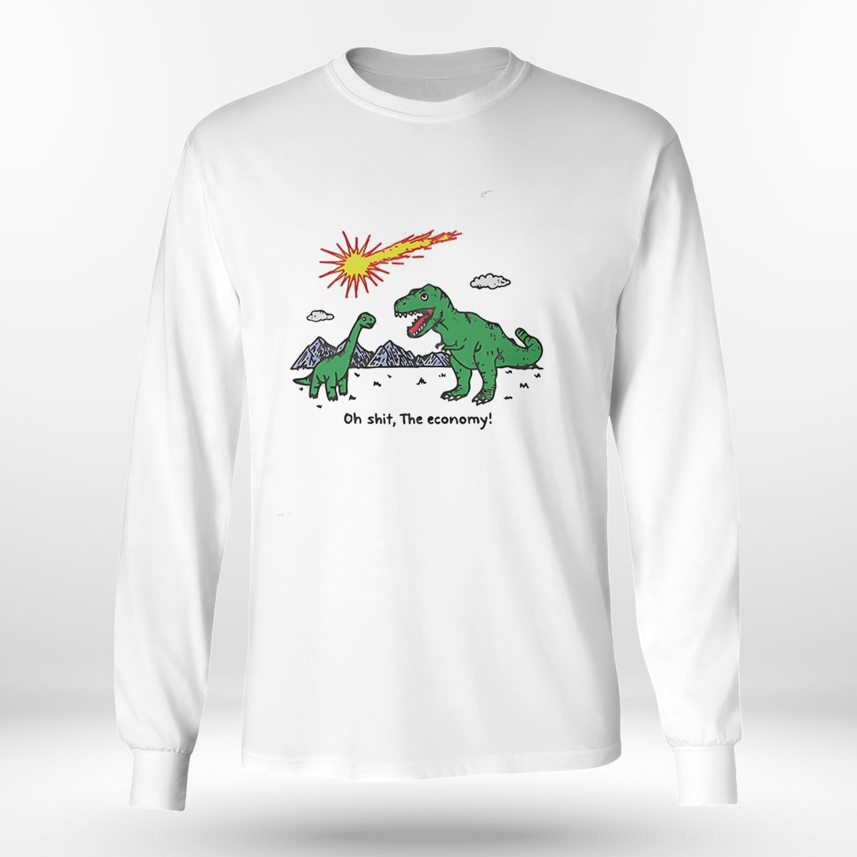 Add a dose of dark humor and social satire to your wardrobe with this “Oh Shit The Economy” dinosaur tee. The design features a group of prehistoric creatures looking up at a falling asteroid, providing a hilarious and relatable metaphor for modern economic anxiety. The artwork is rendered in a playful, cartoonish style that contrasts beautifully with the serious subject matter. Printed on a soft white cotton shirt, the colors are bright and engaging, making it a fantastic conversation starter. It’s a great way to express your feelings about the current world state with a wink and a smile. The fit is relaxed and comfortable, ideal for casual hangouts or a day out with friends. Embrace the absurdity of the times—secure your Oh Shit The Economy Dinosaur Tee today and laugh in the face of the asteroid!.