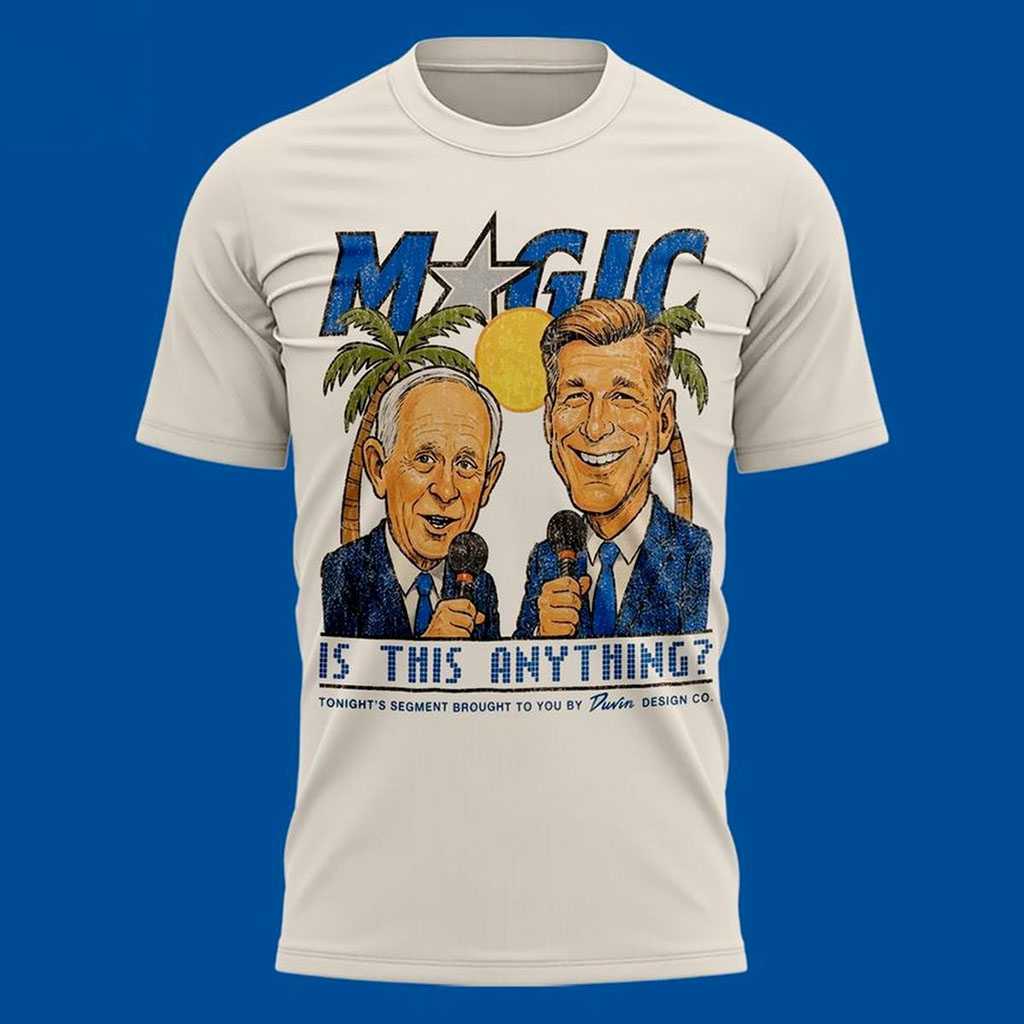 Elevate your fan gear with the Orlando Magic Is This Anything- 2026 Hoodie Tee, a cleverly designed piece that captures the essence of sports speculation. The front proudly displays a stylized blue “MAGIC” logo, beneath which two smiling commentators – one older with white hair, one younger – are animatedly holding microphones, set against a tropical backdrop of palm trees. Below them, the bold question “IS THIS ANYTHING?” is posed, followed by the smaller, intriguing query: “TODAY’S ORLANDO MAGIC IS THIS BY THEN GOOD?”. This witty design humorously reflects the perpetual fan debate and hopeful outlook for the team’s future by 2026, making it an instant conversation starter. The back features a prominent blue and white Orlando Magic basketball logo, dynamically adorned with three trailing stars.