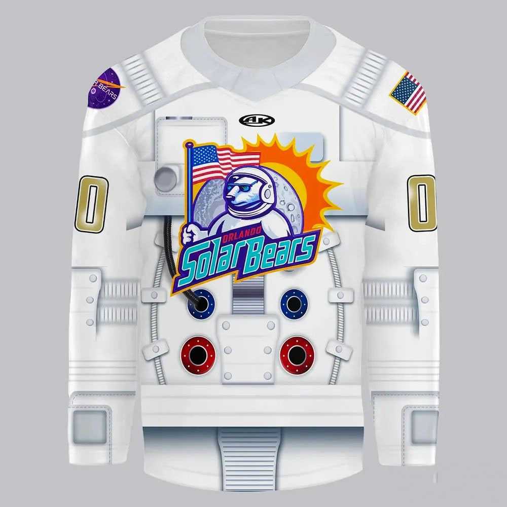 Get ready for lift-off with the incredible Orlando Solar Bears Space Night 2026 Hockey Jersey! This out-of-this-world design transforms you into a hockey-playing astronaut, featuring a full-body white space suit aesthetic complete with detailed grey straps, vibrant red and blue control buttons, and realistic panels across the chest and sleeves. The central graphic showcases a cool blue bear astronaut planting an American flag on the moon, proudly displaying the “Orlando Solar Bears” logo in dynamic blue and gold, all set against a radiant yellow and orange sun. The back even features customizable “ANY NAME” text above a bold “00” number in gold, mimicking a classic jersey. This playful yet detailed design is perfect for fans celebrating the Solar Bears’ intergalactic spirit and Space Night theme.