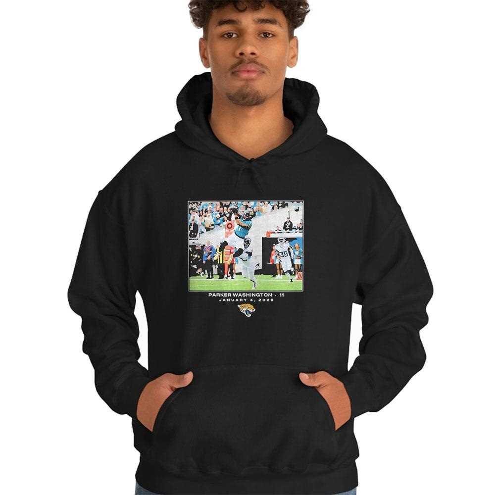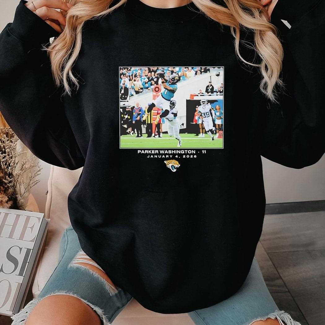Celebrate a breakout performance with this official “NFL Flash Features” player tee for Parker Washington. Commemorating his spectacular Week 18 performance, the design features a high-definition action photograph of the star receiver in his iconic teal and gold Jaguars uniform. The layout utilizes a “magazine-cover” aesthetic, with professional typography and victory motifs that celebrate his contribution to the Duval squad. The vibrant colors and sharp details reflect the high-stakes excitement of the season finale. Crafted from a premium, mid-weight cotton fabric, this shirt provides a comfortable, athletic fit that’s perfect for the Jacksonville heat or casual wear. The high-resolution digital print ensures that every detail of the jersey and the intensity of the play are captured perfectly. This is a must-have collectible for Jaguars fans who are excited about the future of the offense and want to honor a clutch performance. Show your support for the next generation of Jaguars talent with a shirt that is as fast and dynamic as number 11. Represent the future of Duval and celebrate the highlights—order your Parker Washington Jacksonville Jaguars Nfl Flash Features Week 18 Tee today!. T-shirt !