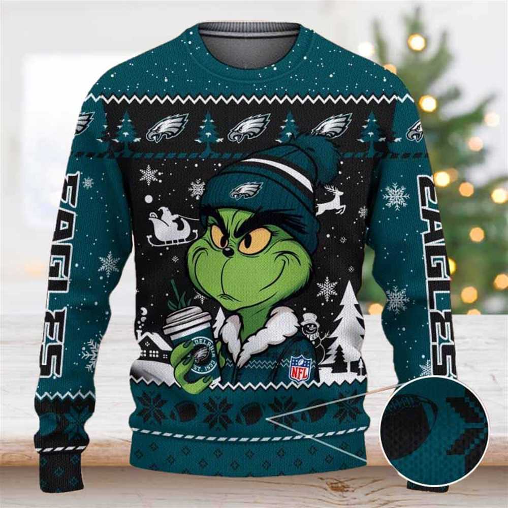 Philadelphia Eagles The Grinch Drink Coffee Ugly Christmas Sweater