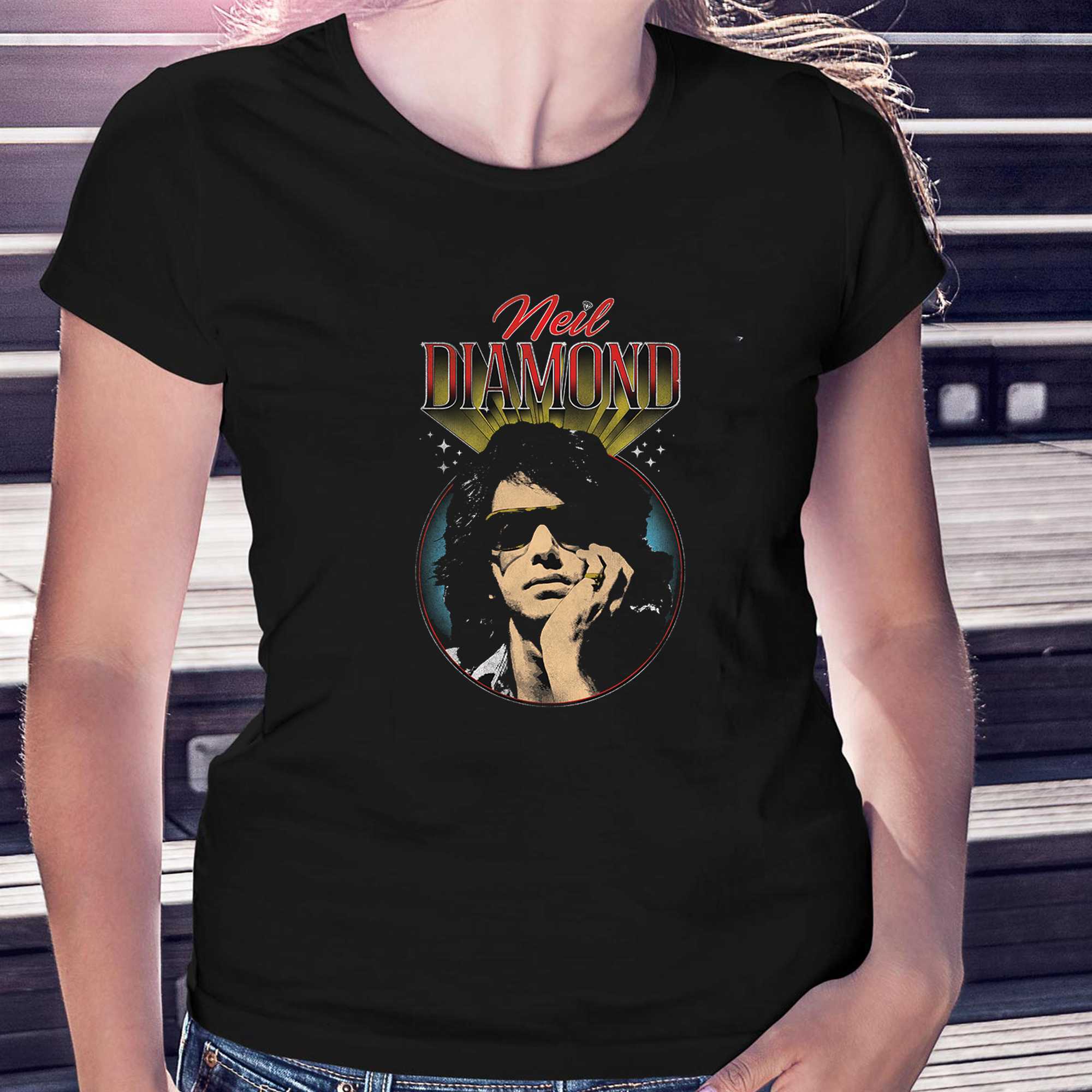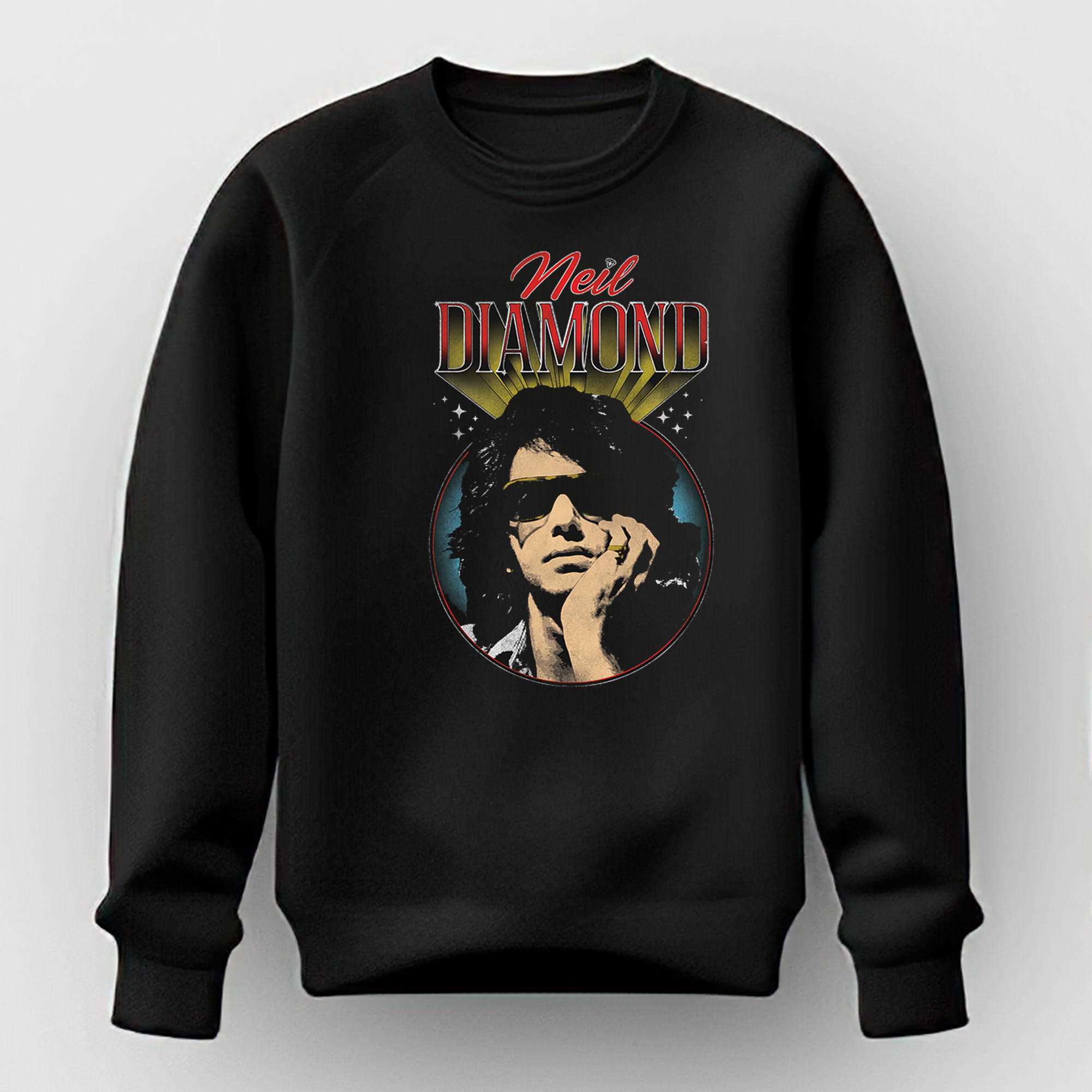 Celebrate the “Jewish Elvis” and a true icon of soft rock history with the sophisticated Photo Neil Diamond Tee. This design features a stunning, vintage-inspired photographic portrait of the legendary singer-songwriter in his prime. The artwork captures Neil’s signature charisma and soulful intensity, framed by elegant retro typography that mirrors the album art of the 70s and 80s. It is a timeless piece of music memorabilia for fans of all generations who grew up singing along to “Sweet Caroline.”Set against a premium black canvas, the warm lighting of the portrait creates a cinematic feel that transitions perfectly from casual daytime wear to an evening concert outing. The shirt is crafted from ultra-soft ringspun cotton, providing a luxurious feel against the skin and a modern, tailored fit. The high-resolution print ensures every detail of the photograph—from the textures of his clothing to the expression in his eyes—remains vibrant and sharp over time. It’s a must-have for collectors who value authenticity and the enduring legacy of a man who sold over 130 million records.Wear your musical taste with pride and honor one of the greatest storytellers of our time. This tee is a conversation starter for fellow enthusiasts and a beautiful way to keep the magic of his music alive. Don’t let the legend fade away. Secure this exclusive tribute and buy the Photo Neil Diamond Tee today to show your love for the real Solitary Man!. T-shirt !