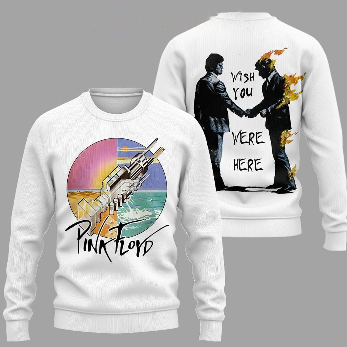 > Honor one of the most significant albums in rock history with this sophisticated Pink Floyd tribute. The design features the iconic “handshake” artwork from the 1975 masterpiece Wish You Were Here, rendered with a clean, high-contrast aesthetic. Set against a premium white fabric, the colorful flames and industrial backdrop of the graphic stand out as a testament to the band’s artistic depth. This hoodie utilizes a heavyweight, ringspun cotton that offers a structured look and a luxurious feel. The minimalist approach on the front is balanced by a subtle list of the album’s tracklist on the lower hem, appealing to the most dedicated audiophiles. It is a perfect blend of high-concept art and casual comfort, making it a versatile piece for concerts or daily wear. The graphics are applied using eco-friendly, water-based inks that integrate into the fabric for a soft-hand finish. Experience the legacy of prog-rock and showcase your musical taste—get the Pink Floyd Wish You Were Here Tee Hoodie-1 now and shine on!. Our Pink Floyd Wish You Were Here Tee Hoodie meets all of your needs: it’s warm and cozy, lightweight and roomy, and built to last. It features dropped shoulders and a standard fit to offer a high level of comfort and ease of movement.