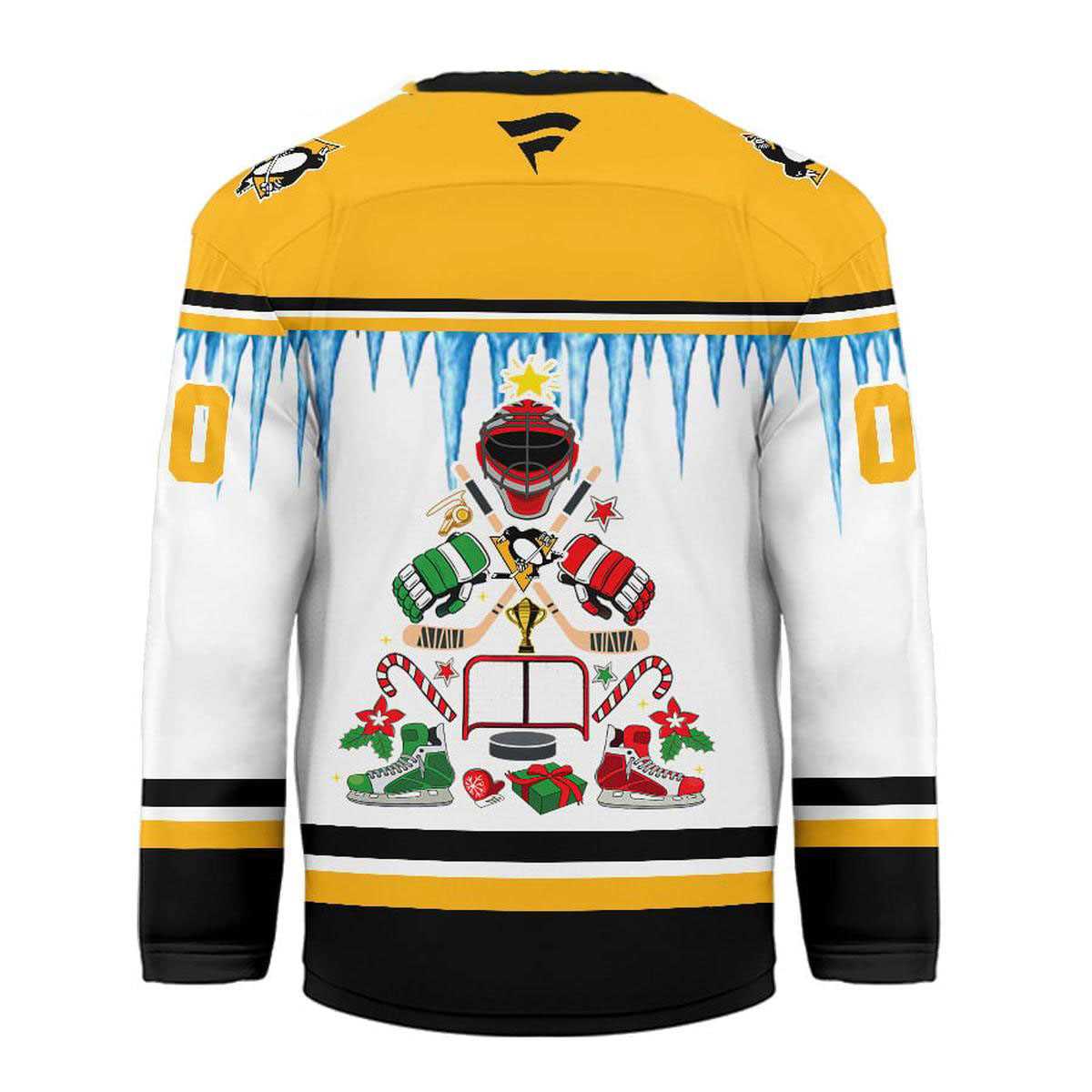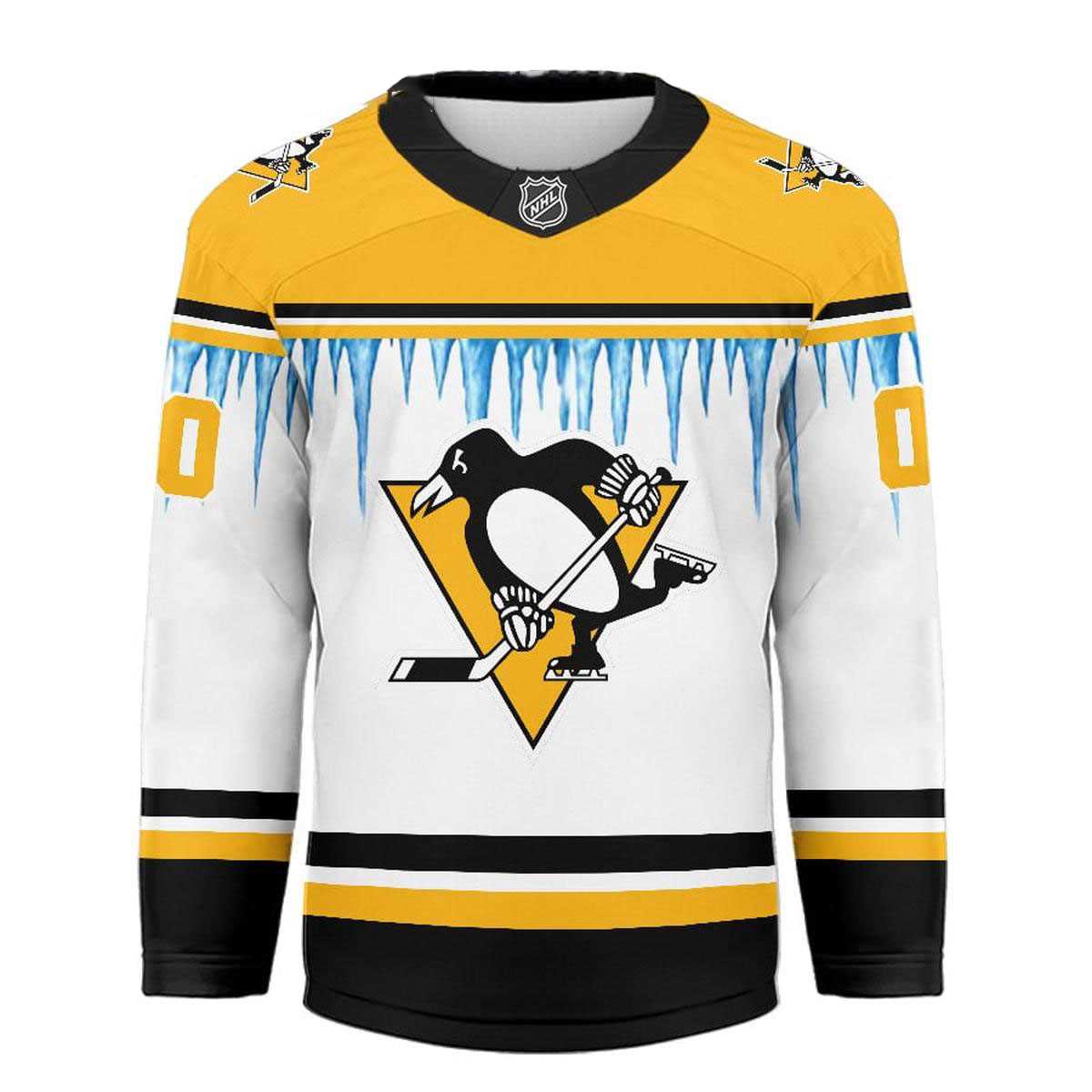 - Introducing the Pittsburgh Penguins Icicle Christmas Tree Custom Hockey Jersey , the perfect addition to any fan’s collection! There is no mascot in the league more suited for a winter-themed jersey than the Penguin, and this Pittsburgh design takes full advantage of that connection. Utilizing the team’s bold black and Pittsburgh gold colors, this jersey creates a striking visual impact. The “icicle” effect dripping from the white shoulders down the gold sleeves and black chest looks incredibly natural, as if the penguin has just emerged from an icy swim. The skating penguin logo sits proudly in the center, framed by the frost, merging team spirit with winter weather perfectly.