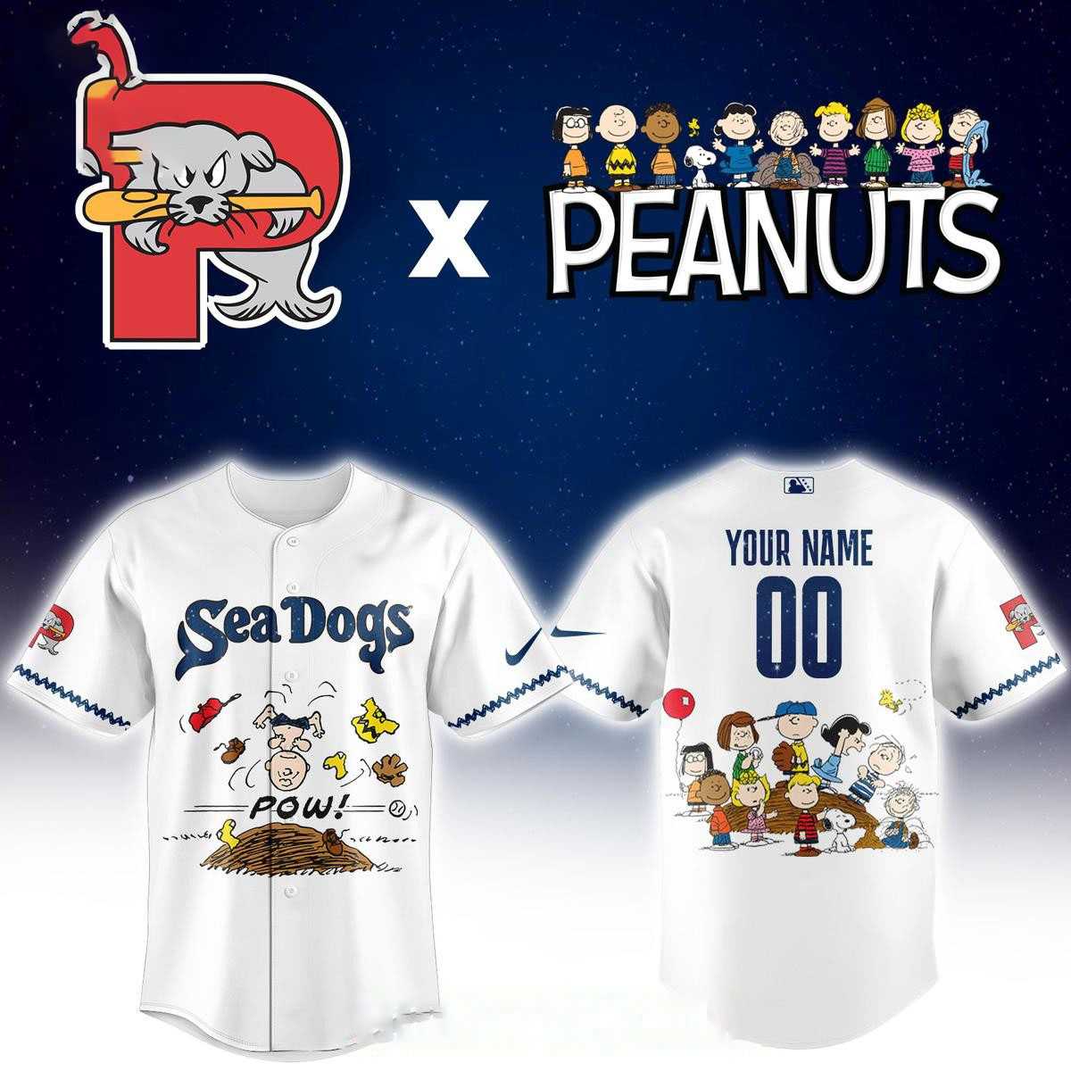 Join the gang and hit a home run by ordering your Portland Sea Dogs Peanuts Night 2026 MiLB Custom Baseball Jersey now!
