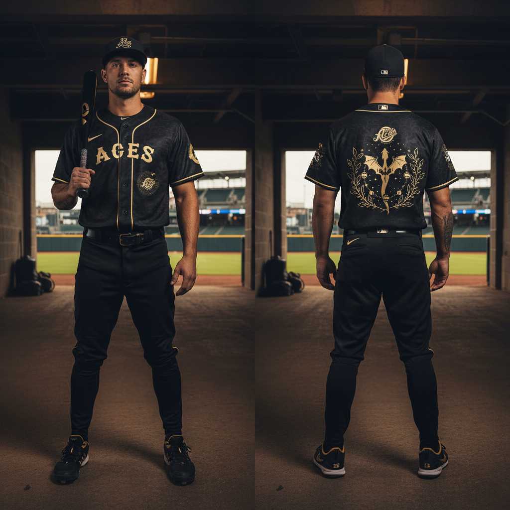 The design features a sleek all-black base with shimmering gold accents that mimic dragon scales and mystical energy. The “ACES” name on the front is reimagined in a sharp, draconic font, while the back showcases a majestic gold dragon wing graphic that spans across the shoulders. It’s a fierce and powerful look that combines the intensity of professional baseball with the allure of a high-fantasy world.