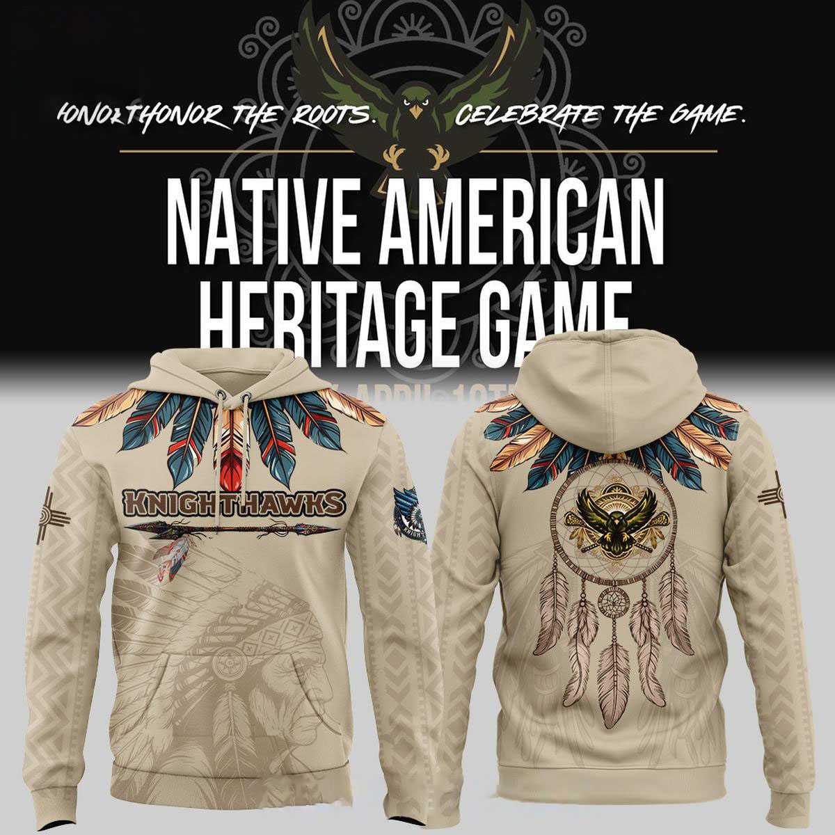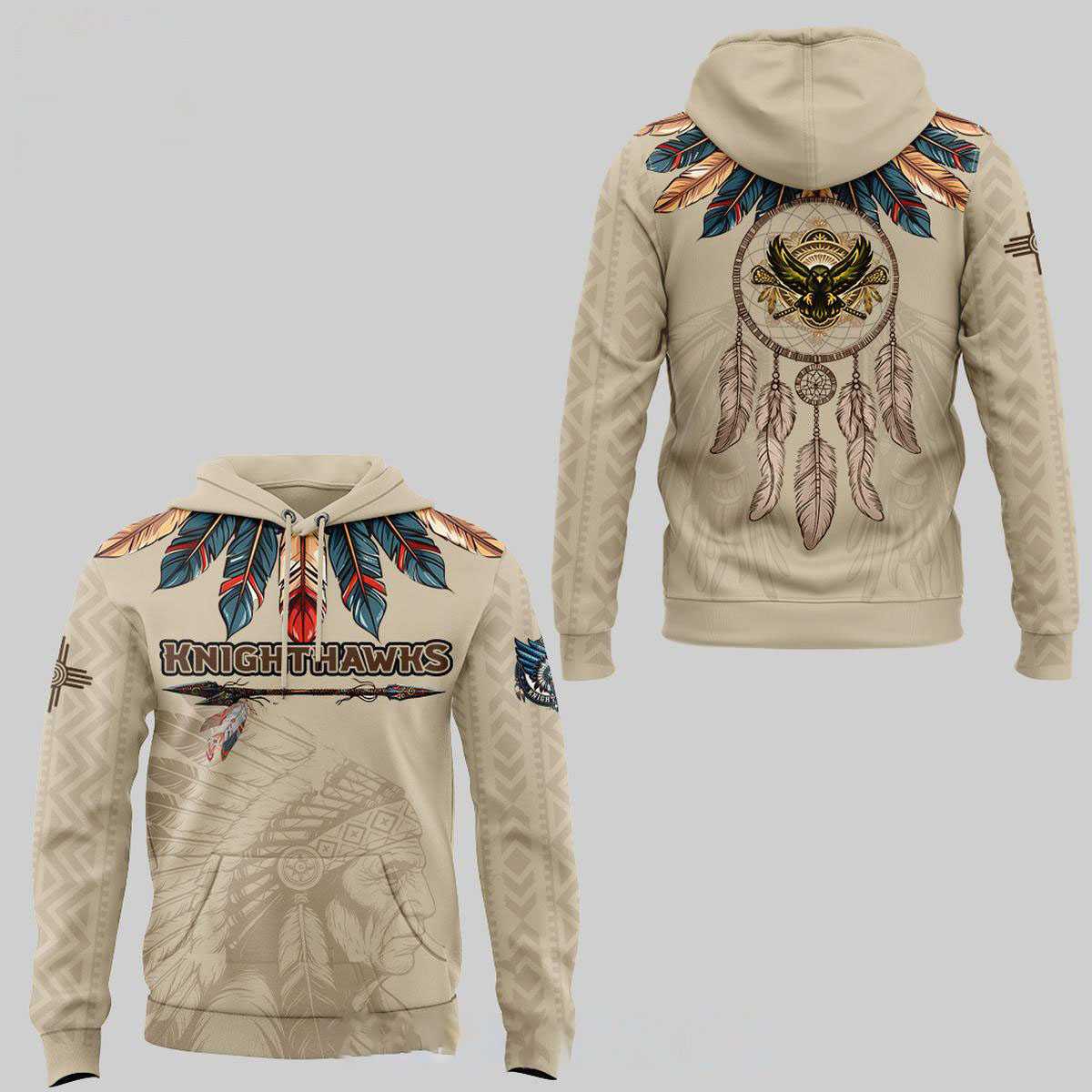 Unleash your spirit with the Rochester Knighthawks Native American Heritage 2026 Night Shirt Hoodie, a captivating garment blending team pride with profound cultural artistry. This beige hoodie features a stunning front adorned with a vibrant “feather collar” in striking blues, rustic oranges, and bold reds, leading to “KNIGHTHAWKS” lettering underlined by an arrow. Subtle traditional patterns and a headdress outline grace the lower front, while sleeves sport chevron designs and tribal patches. The back reveals an intricate dreamcatcher, centrally showcasing a powerful black eagle emblem, surrounded by delicate hanging feathers and detailed patterns. This design beautifully celebrates Native American heritage with elegance and sporting allegiance, making a powerful visual statement.