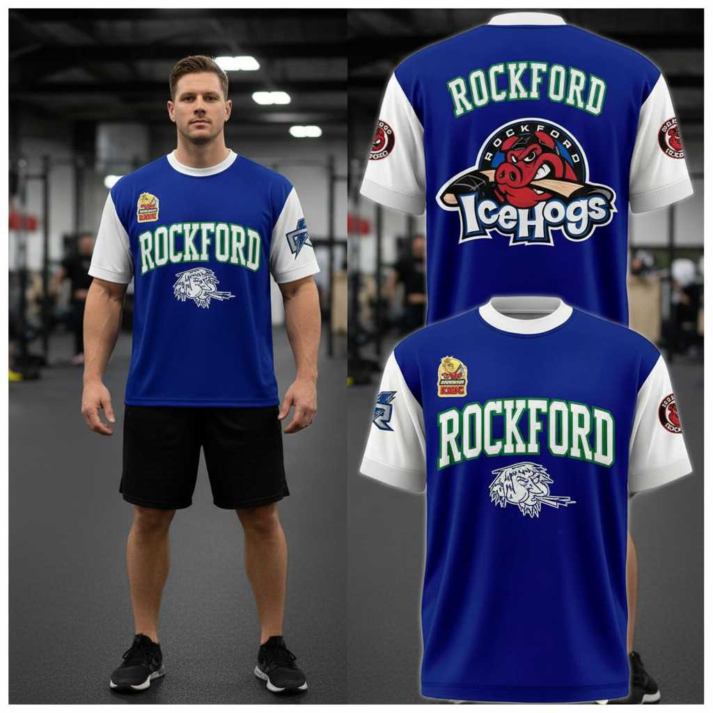 Step into the rink-side rivalry with the official Rockford IceHogs Rockford Icemen 2026 Theme Game Shirt Hoodie! This vibrant royal blue shirt, accented with crisp white sleeves and collar, proudly displays ‘ROCKFORD’ in bold green and white across the chest. Below, a captivating white graphic depicts a whimsical, frosty Iceman character, adding a unique, playful twist. The left chest features a yellow ‘Rockford Icemen’ patch with a striking red ice pick. Turn around to reveal the iconic ‘ROCKFORD IceHogs’ logo on the back, featuring a fierce red hog on skates, stick in hand, surrounded by an ‘IceHogs’ wordmark. The sleeves carry subtle team branding, creating a dynamic, spirited design that captures the essence of a legendary theme game showdown.