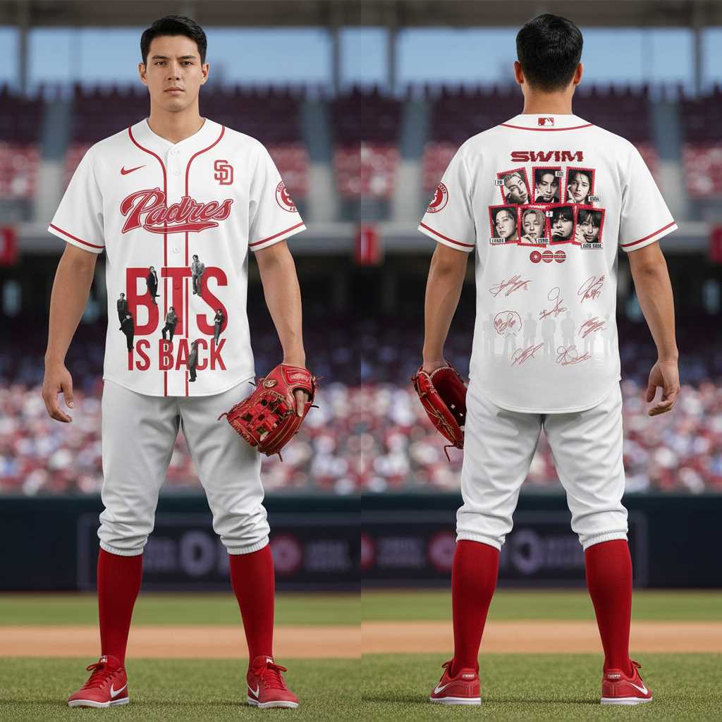 Prepare for a grand slam of style and fandom with the San Diego Padres Celebrate BTS Is Back Swim Jersey! This exceptional white jersey, adorned with vibrant red piping, masterfully blends baseball allegiance with K-pop enthusiasm. The front proudly displays “Padres” in iconic red script, beneath which “BTS IS BACK” explodes in bold red lettering, playfully featuring miniature silhouettes of the seven BTS members perched atop each letter, seemingly announcing their return to the world stage. Turn around, and the back reveals “SWIM” at the top, followed by a striking grid of seven individual framed portraits of the beloved K-pop idols, complete with their names, and finished with authentic-looking red signatures across the lower panel. This design is a witty homage, celebrating the boys’ anticipated comeback with a unique, energetic sports aesthetic.