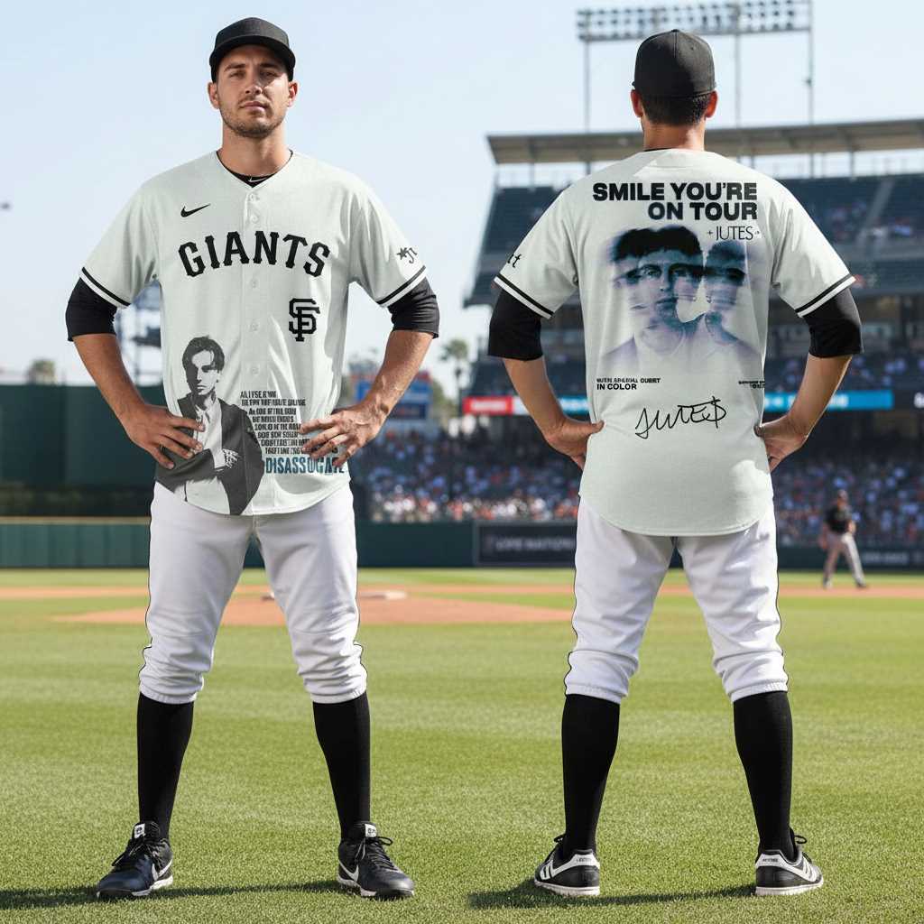 Step up to the plate in unparalleled style with the exclusive San Francisco Giants Jutes Smile You’re On Tour Baseball Jersey. This isn’t just a jersey; it’s a statement piece celebrating your love for the Giants combined with unique artistic flair, ensuring you stand out in the stands or on the streets, reflecting a blend of team loyalty and contemporary design.