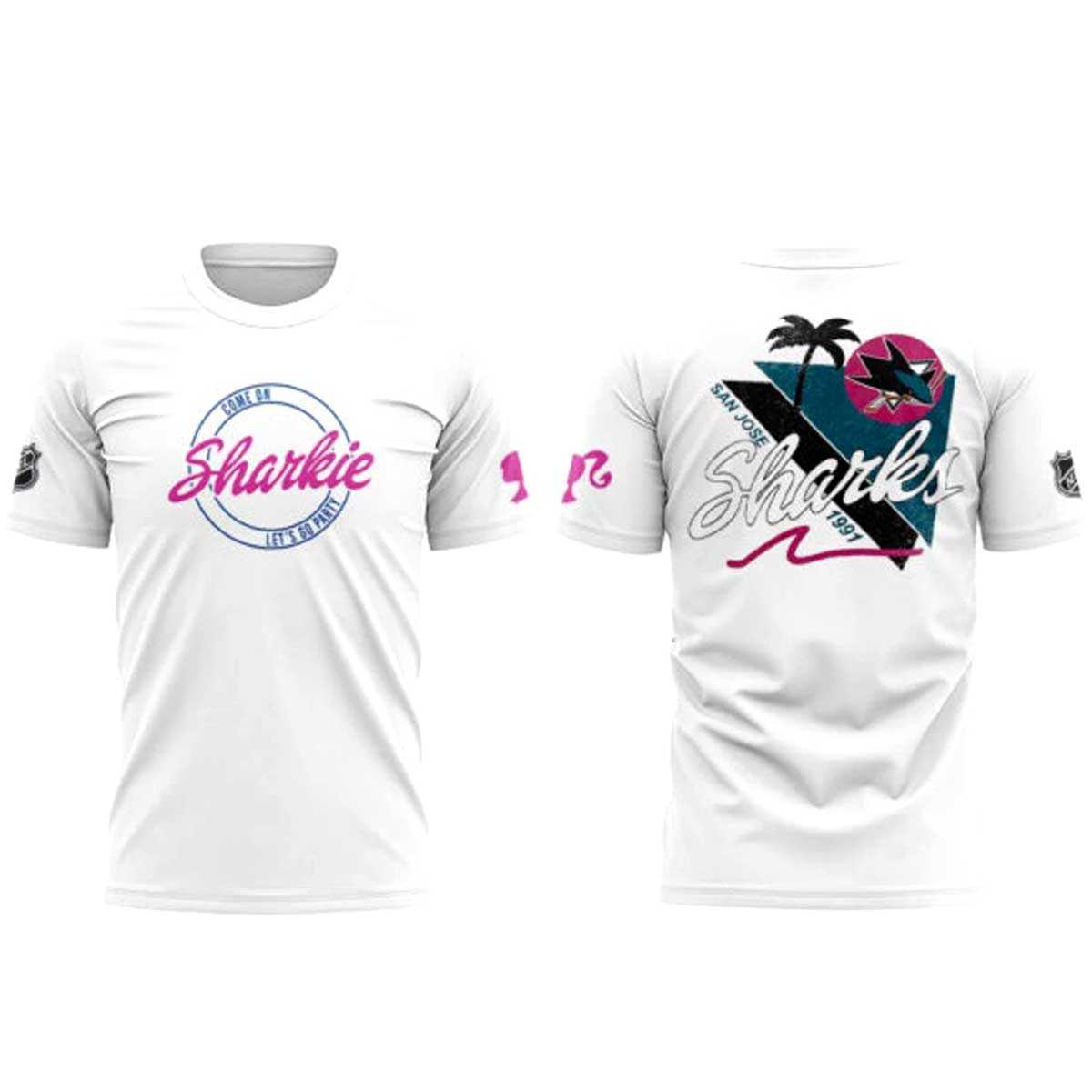Unleash your inner fan with a vibrant twist in the San Jose Sharks Barbie Collaboration Edition Hoodie! This eye-catching apparel perfectly marries fierce hockey fandom with iconic pink glam, creating a truly unique statement. The front showcases a playful circular crest featuring a teal shark with a hockey stick, proclaiming “Sharkie” and “Let’s Go FINS! EST. 1991” in charming pink and white. Spin around to reveal an epic back design: a dynamic teal shark holding a stick, erupting from geometric patterns, topped by a retro San Jose sunset graphic with palm trees and a swirling “Sharks EST. 1991” text. All this set against a radiant pink backdrop subtly printed with repeating “Barbie” logos and a bold “Barbie COLLABORATION” slogan, celebrating the unexpected and humorous fusion of two legendary worlds.